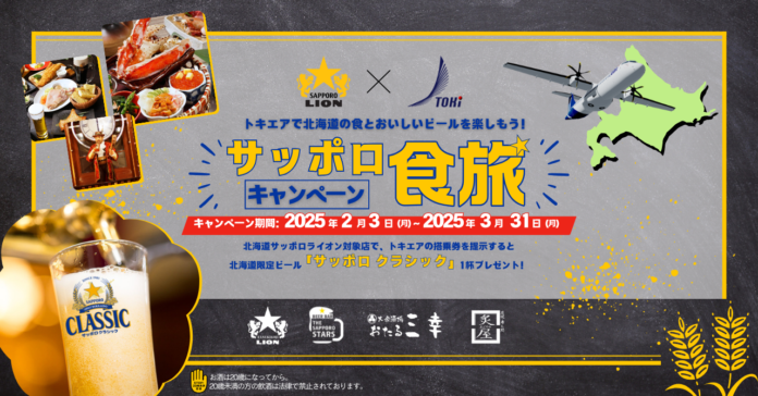 新潟拠点の地域航空会社トキエア株式会社(本社:新潟県新潟市 代表取締役:長谷川政樹、以下トキエア)は、株式会社北海道サッポロライオン(本社:北海道札幌市 代表取締役社長・金森貴光、以下北海道サッポロライオン)と連携し、2025年2月3日(月)~2025年3月31日(月)の期間「サッポロ食旅キャンペーン」を実施し、トキエア札幌(丘珠空港)着便をご利用されたお客様に、対象店舗にて北海道限定ビール「サッポロ クラシック」1杯をプレゼントいたします。