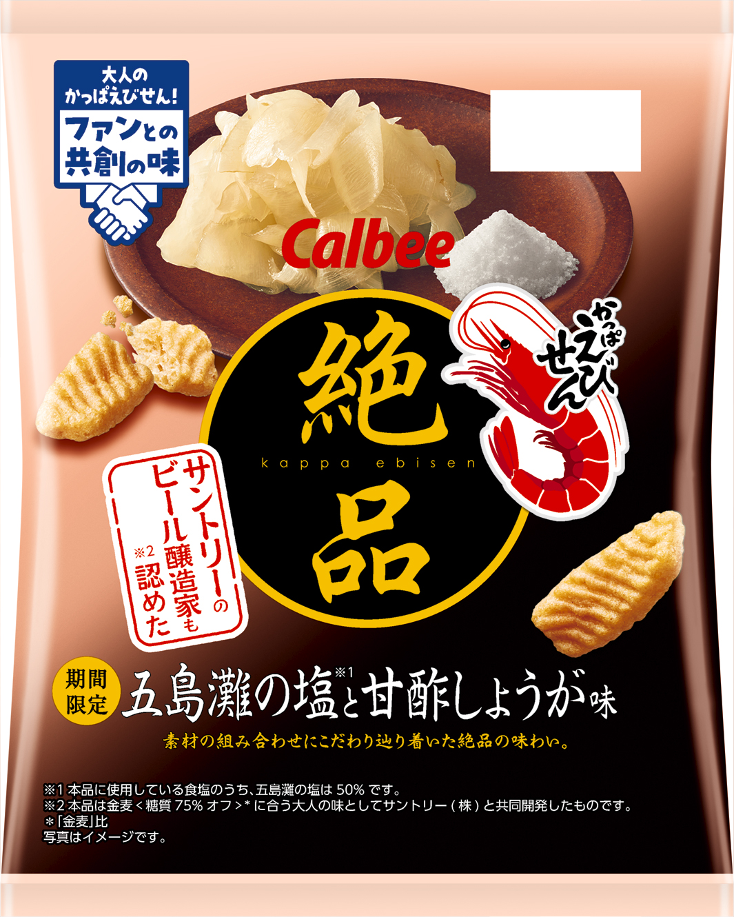 カルビー株式会社(本社:東京都千代田区、代表取締役社長:江原 信)は、“やめられない、とまらない♪”でおなじみの「かっぱえびせん」より、「絶品かっぱえびせん」ファンコミュニティ絶品部とサントリー株式会社(以下、サントリー)と共同開発した、お酒のおつまみ向けとして素材の組み合わせにこだわった『絶品かっぱえびせん 五島灘の塩※3と甘酢しょうが味』を2025年2月3日(月)から全国のコンビニエンスストア先行で期間限定発売します。コンビニエンスストア以外の店舗では2025年2月17日(月)から期間限定発売します。2025年5月下旬終売予定。