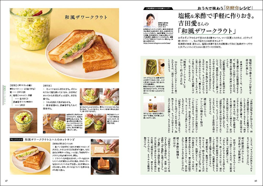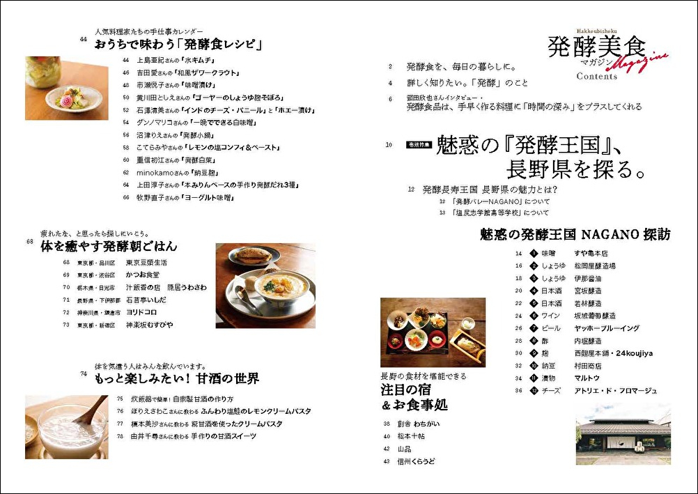 朝ごはんで発酵食が楽しめるお店の紹介や、ますます注目を集める甘酒を手作りしたり、パスタやスイーツに使って楽しむ甘酒企画も掲載。発酵食のことをもっと知って、作って、食べて楽しめる『発酵美食マガジン』。発酵食に関するあらゆる情報をぎっしり詰め込んだ1冊です。