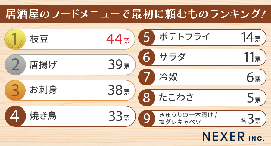 今回、株式会社NEXERは「居抜きの神様」と協力し、事前調査で「居酒屋によく行く」と回答した全国の男女200名を対象に「居酒屋のフードメニューで最初に頼むもの」についてアンケートを実施しました。その結果をランキング形式でお届けします。