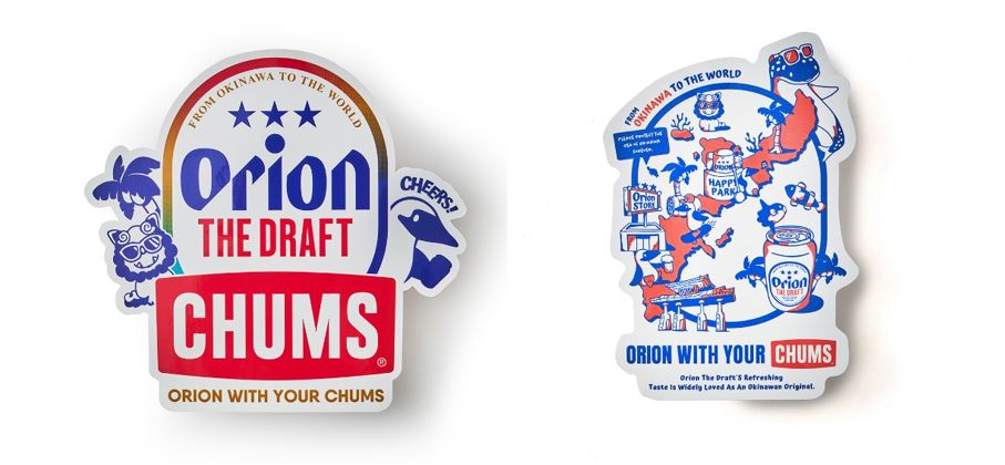 コラボレーションのアイコンは、美ら島沖縄をテーマにCHUMSのマスコット「ブービーバード」と「オリオンザ・ドラフト」ロゴデザインを組み合わせた2種類のビジュアルを作成しています。1つは、定番のオリオン ザ・ドラフトのロゴからひょっこりと顔を出すブービーバードとシーサーがとってもキュートなデザイン。もう1つは、沖縄のマップの上に守礼門、オリオンビール工場と一緒にシーサーやジンベエザメたちが並ぶ沖縄気分全開のデザイン。ORION×CHUMSコラボならではの沖縄要素と楽しさをミックスさせたビジュアルに仕上げました。