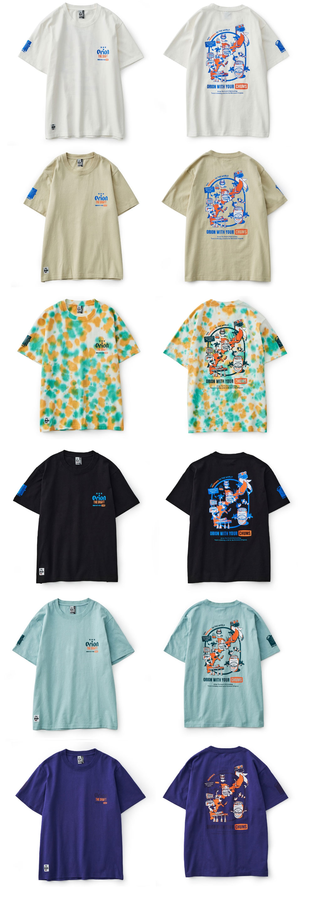 オリオンビールでは、「アウトドアシーンで大勢の仲間達と楽しい時間を過ごして欲しい。そして、豊かな自然を楽しみ、大切に思う共感の輪を広げたい。」という思いから、人気アウトドアカジュアルブランドの「CHUMS(チャムス)」とのコラボアイテムを2021年から発売しています。今年も春夏のレジャーシーンをさらに盛り上げる新作アイテムを計9点発売します。毎年大人気のコラボTシャツやアロハ風シャツに加えて今年は新しく、シャツとセットアップで着用できる新作のショーツや、ソックスなどもラインナップに加わりました。