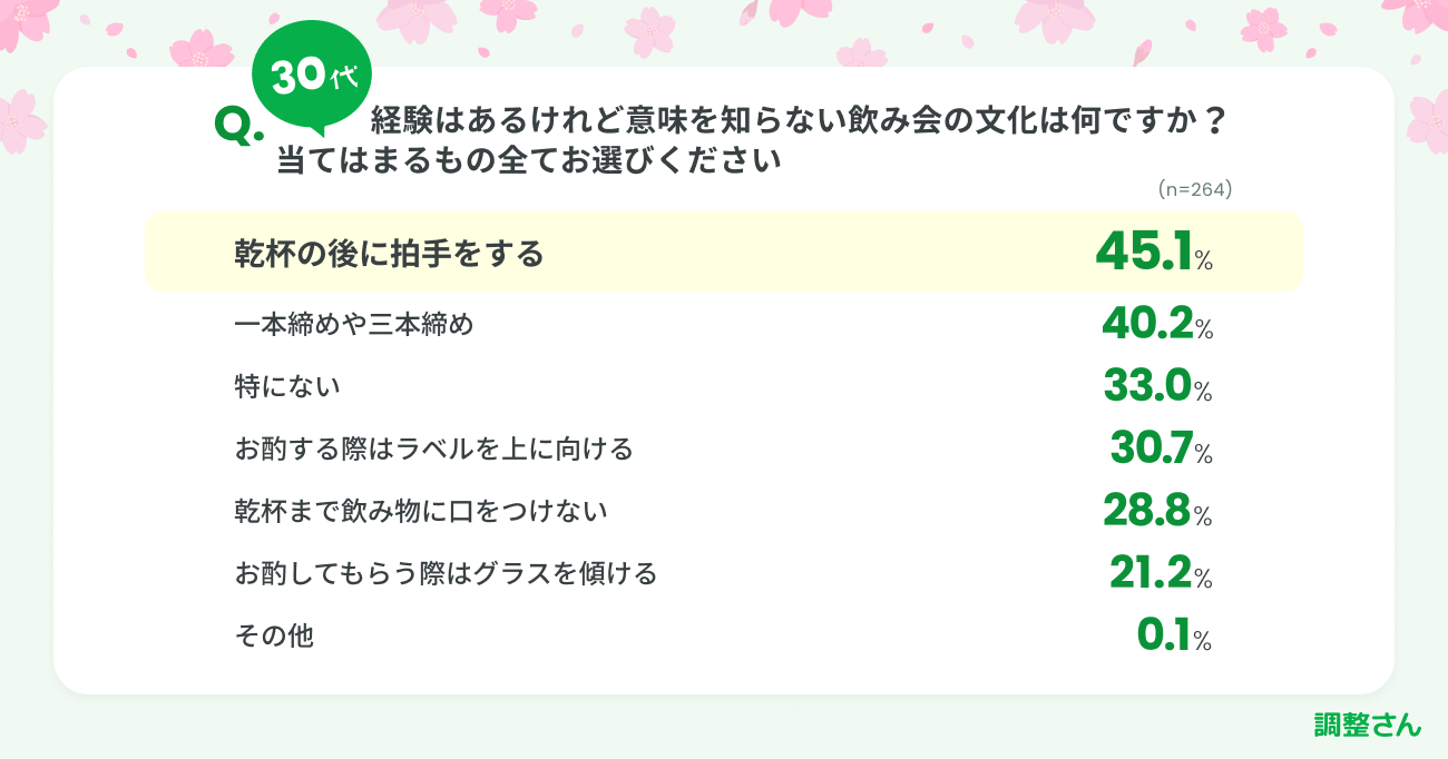 20代・30代の1位「乾杯の後に拍手をする」共に半数程度が回答
