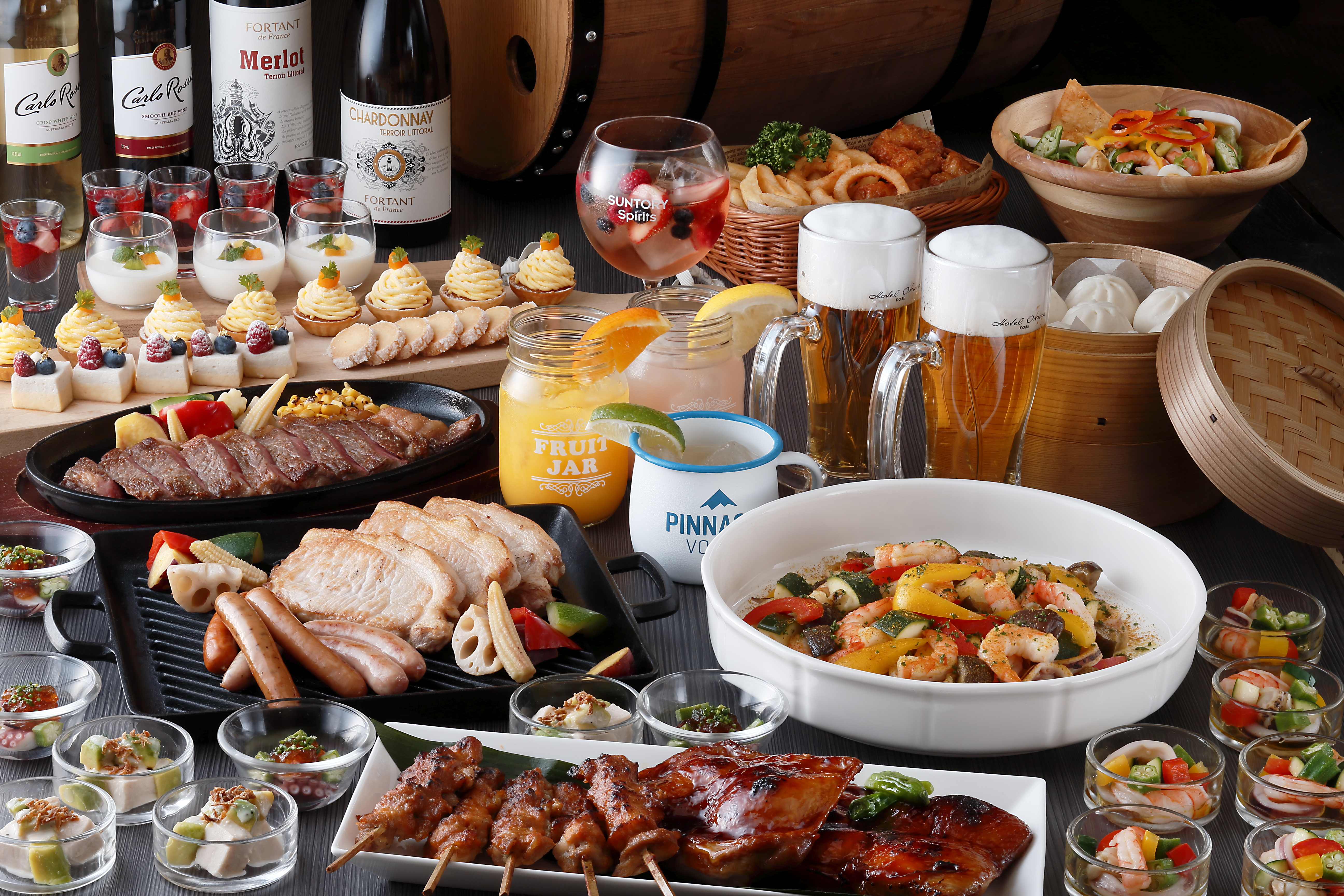 軽く炙った鰹のカルパッチョ、チキンと夏野菜の棒々鶏風マリネ、照り焼きチキン 柚子胡椒風味、粗挽きスモークウィンナーのグリル、海老とアスパラガスのチリソース煮、アクアパッツア、串揚げ各種、国産牛ローストビーフ、オークラ神戸特製牛すじのカレー、マンゴーロールケーキ