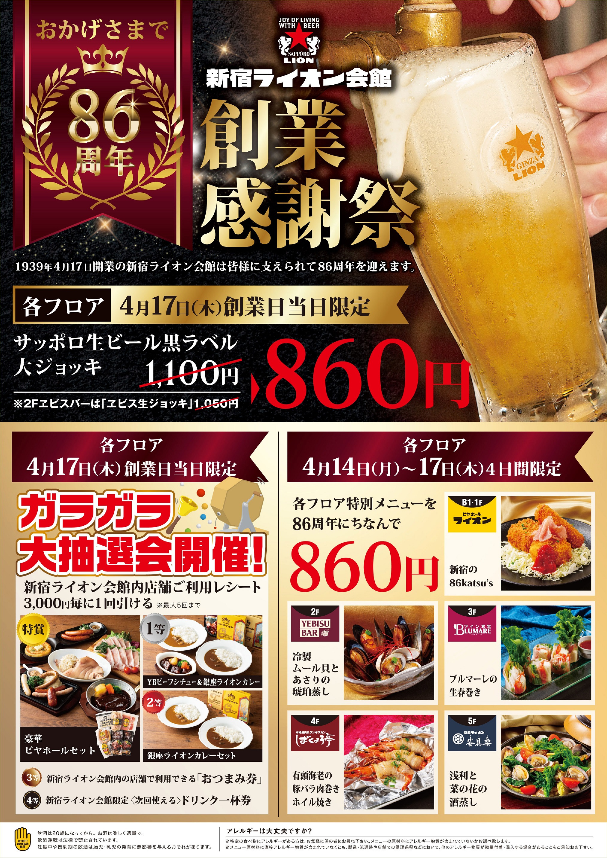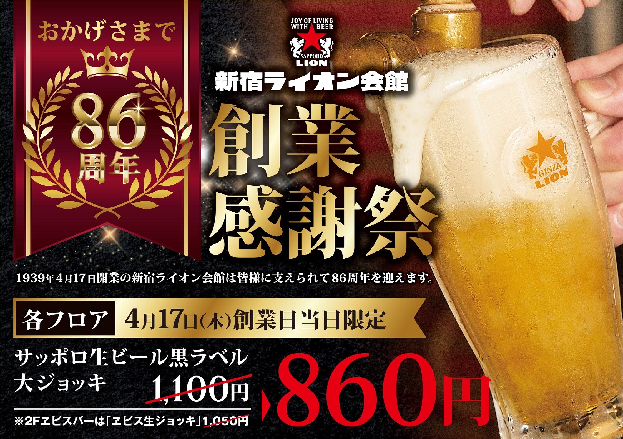 各フロアで販売している「サッポロ生ビール黒ラベル」の大ジョッキ(通常価格1,100円)を特別価格860円で提供します。