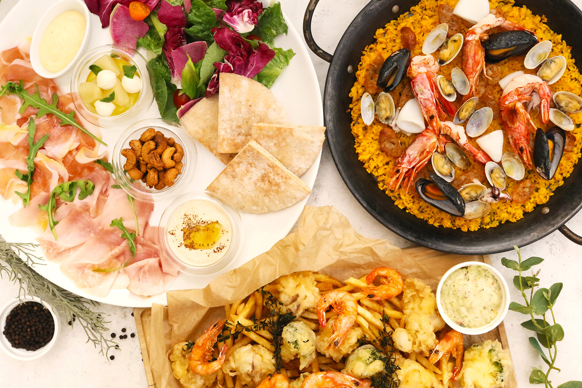 ピタブレッドや野菜で楽しむディップ、カジュアルで軽やかなフリットミストなど、会話もお酒も進むラインナップ。