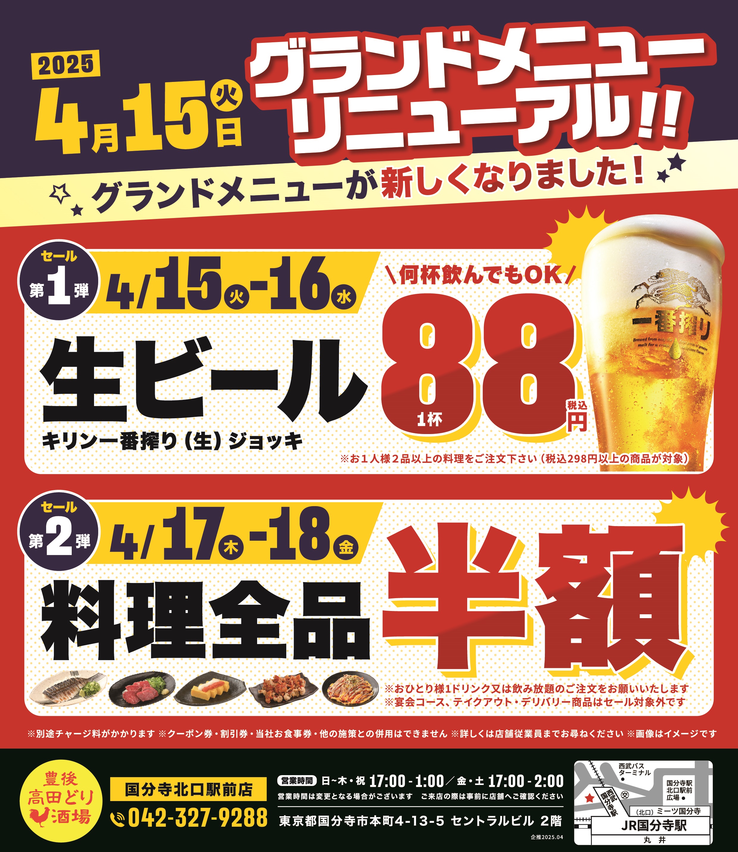「白木屋」「魚民」「目利きの銀次」などを全国に展開する株式会社モンテローザ(本社:東京都杉並区、代表取締役:大神輝博)は、2025年4月15日(火)に豊後高田どり酒場 国分寺北口駅前店のグランドメニューをリニューアルします。