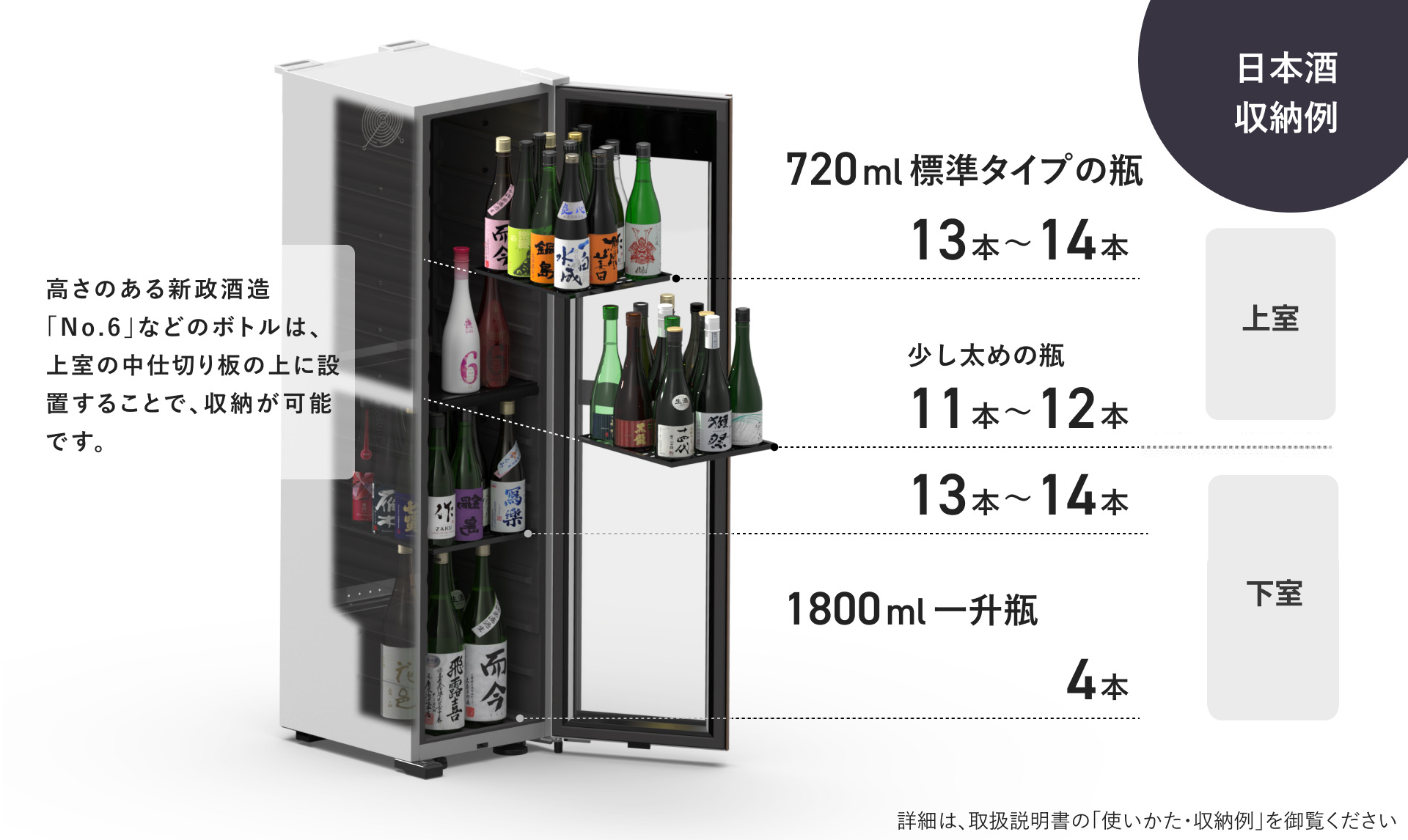 日本酒 :四合瓶 41~50本 (720ml) / 一升瓶 最大14本 (1800ml)