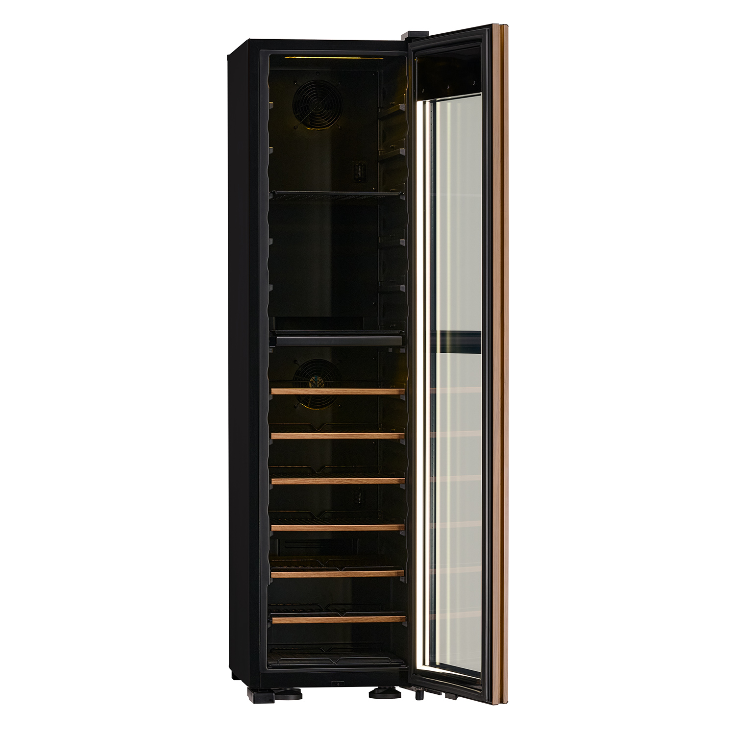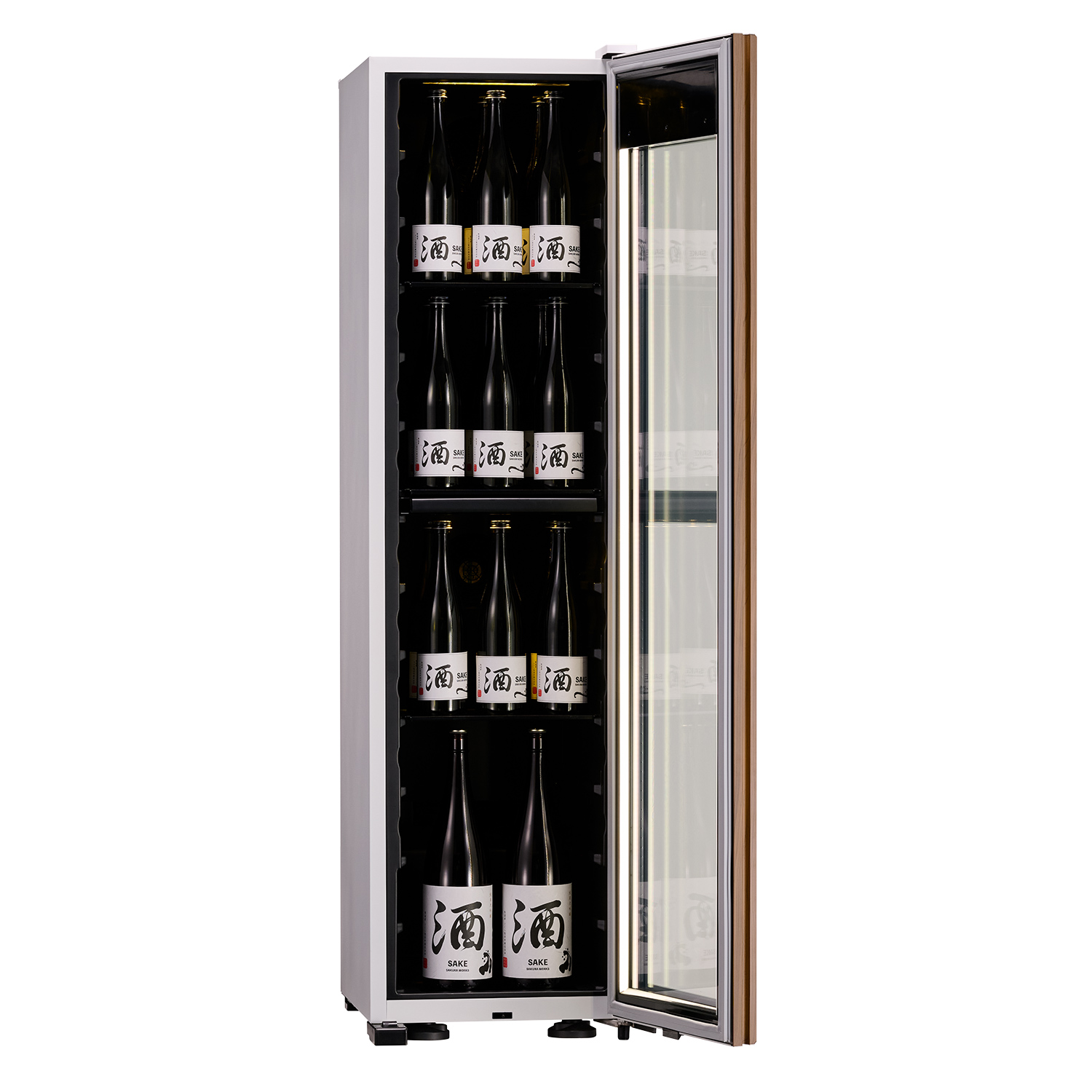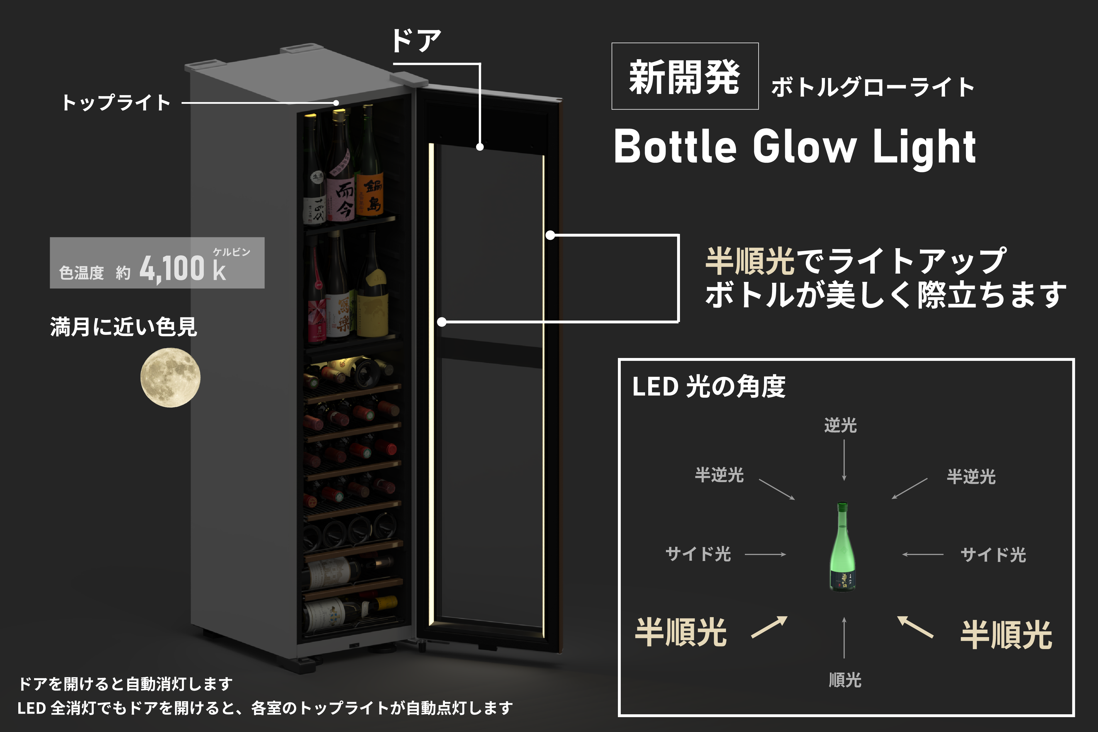 新開発のドアには、**「ボトルグローライト」**を搭載。 ドア裏に配置された満月のような色調のLEDが、ボトルを柔らかい“半順光”で照らし、これまでにない鮮明さでラベルを美しく引き立てます。