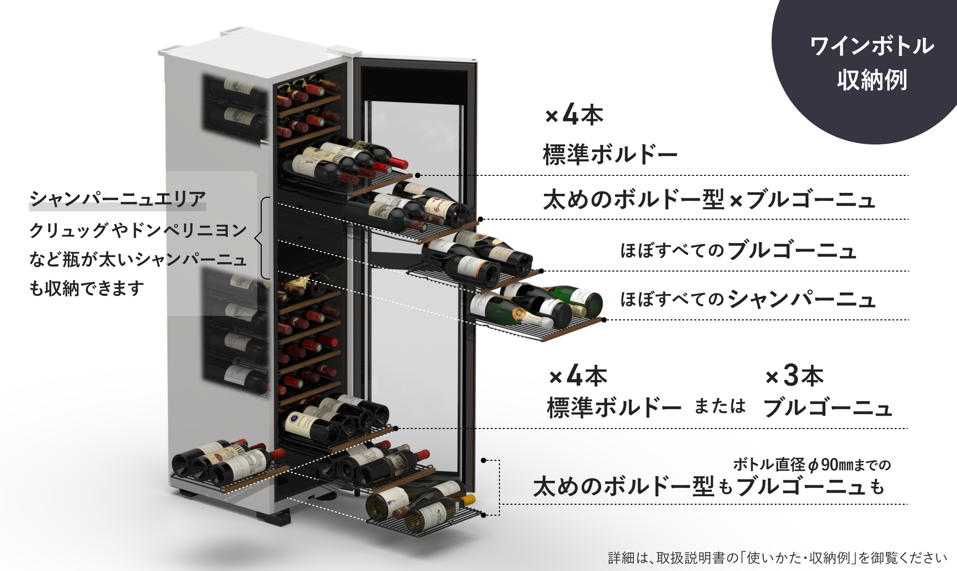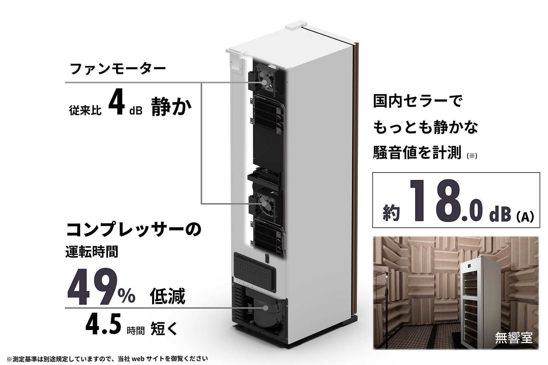 ※4 自社調べ 設定温度、省エネ性、温度緻密性の情報開示、ドアスペック、サイズ、収納本数よりワインセラー、日本酒セラーであって、ガラスドアのショーケースをwebにて調査して比較。対象国は、日本、中国、米国、台湾、香港、韓国、フランス、ドイツのweb通販店にて掲載されている製品に限ります。2025年4月14日時点