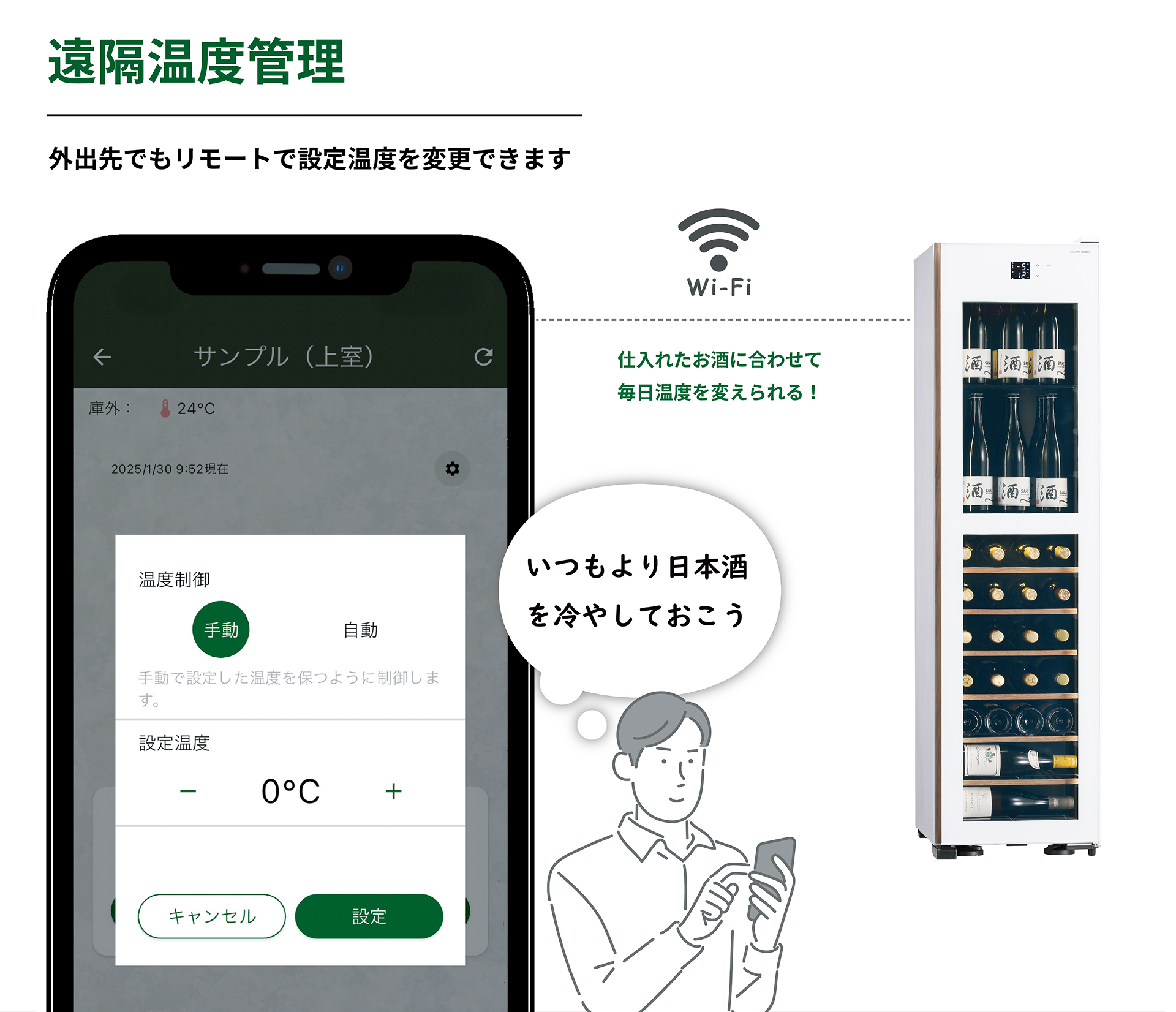 スマホ連携による遠隔操作と、-5℃~25℃まで対応できる2温度管理。ふたつの強みを備えた未来型セラー