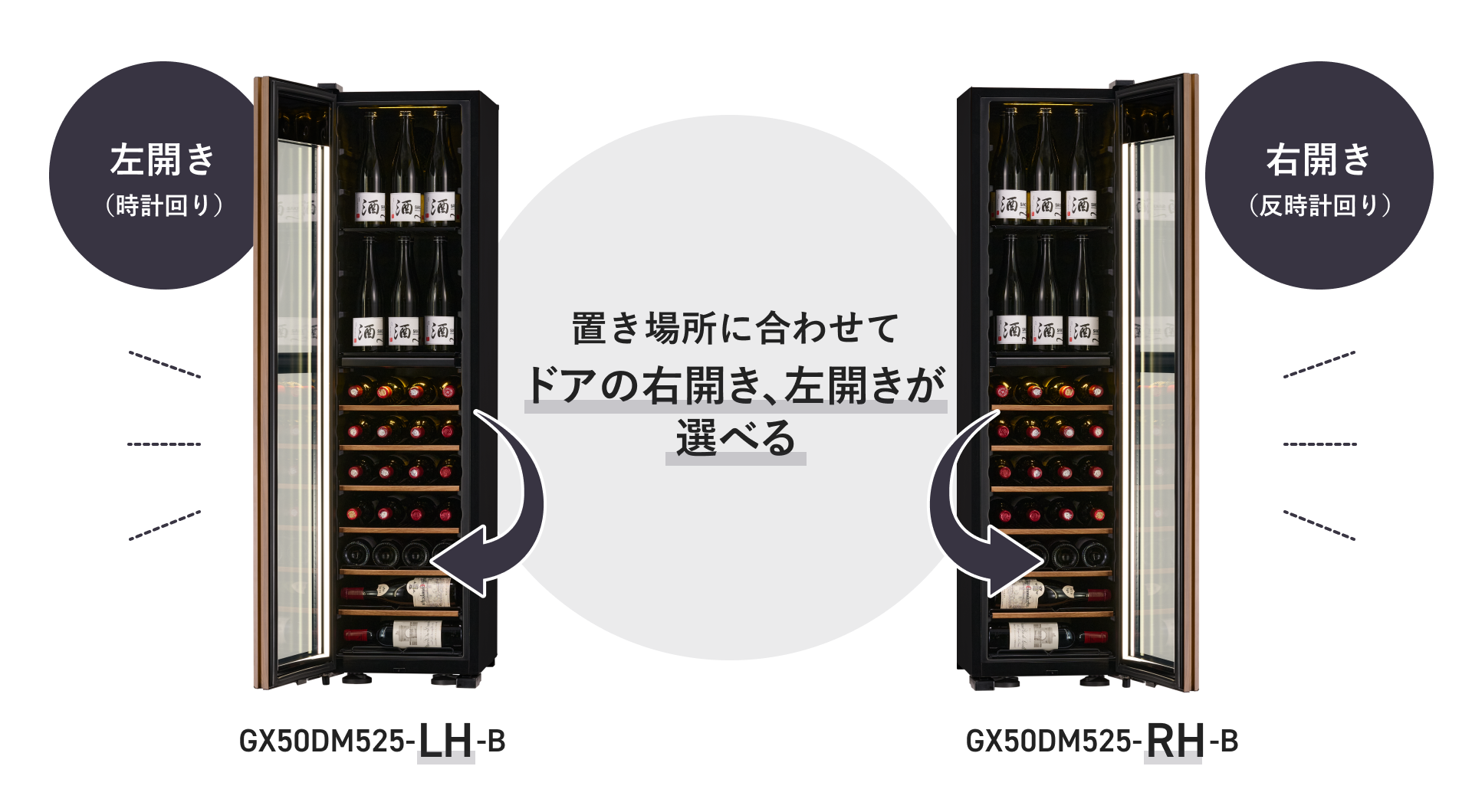 氷温M5 GX50は、1台で異なる温度帯を設定できる2温度管理セラー。 上室は-5℃〜25℃、下室は0℃~25℃と幅広く対応し、日本酒とワイン、白と赤など、異なるお酒を最適な温度で保管できます。さらに、左右開きの2モデルをラインナップ。 設置場所にあわせて左右でドアの開閉方向を選べるので、空間の制約を受けずに導入可能です。2台並べて使えば、最大100本収納&4温度帯の同時管理も実現。 日常使いから本格コレクションまで、あなたの“お酒の楽しみ”をひとつ上のレベルにします。