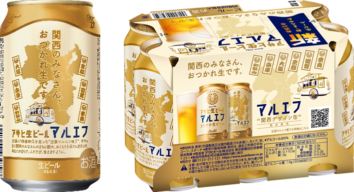 関西エリア限定でオリジナルデザイン缶を5月8日から発売します。缶体には関西エリアの地図とマルエフカーを描き、2府4県で出張マルエフ横丁を展開することを記載しています。