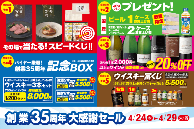 おかげさまでリカーマウンテンは創業35周年!4月24日からたくさんの感謝企画と共に「創業35周年大感謝セール」を開催致します