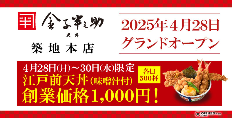 人気飲食店、つけ麺「つじ田」や、「中華そば専門 田中そば店」などをグループで運営する、オイシーズ株式会社(所在地:東京都 千代田区 、代表取締役社長:工藤 智、以下:オイシーズ)傘下の株式会社バイザ・エフエム(所在地:東京都千代田区、代表取締役:大塚 大介)は、2025年4月28日(月)に「日本橋 天丼 金子半之助」の新たなフラッグシップ店舗となる「日本橋 天丼 金子半之助 築地本店」を東京都中央区築地にオープンいたします。