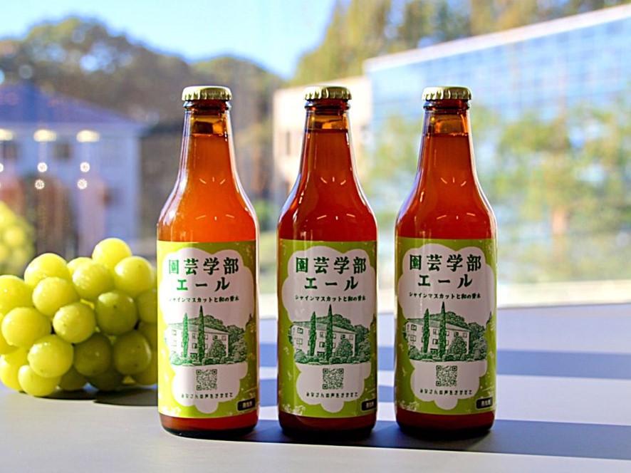 千葉大学園芸学部では、「園芸フロンティア研究プロジェクト」の一環として、植物工場とデータサイエンスの活用により、ぶどうの果実成分をデザインする技術の開発にも取り組んでいます。園芸学部エールは、シャインマスカットの加工利用への拡大とそのための技術開発を目指し、地域のブルワリーと協力しながら開発を進めてきたクラフトビールです。