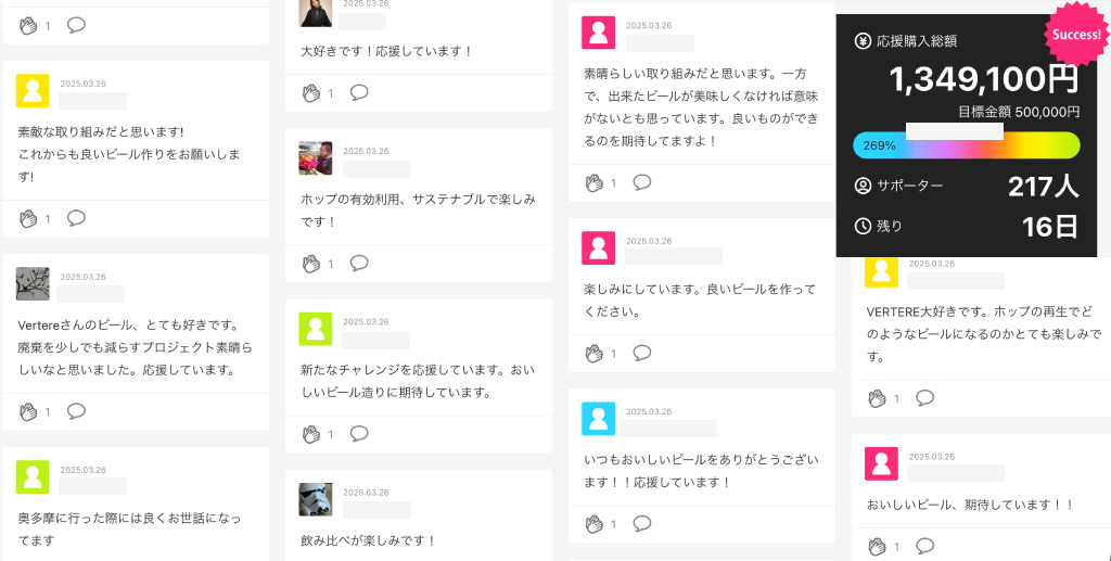 5月2日時点で、応援購入総額1,349,100円【目標金額269%】に達しました。