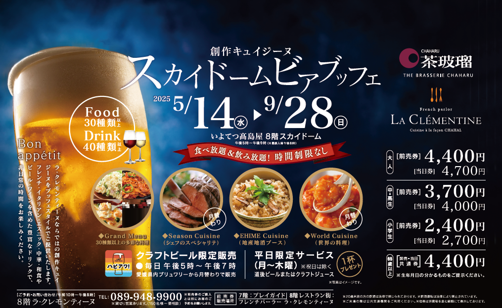 この度、いよてつ高島屋8階スカイドーム内の「創作キュイジーヌスカイドームビアビュッフェ」にて、「ハピアワ!」プロジェクトがこちらでもスタートします!愛媛県内のブルワリーが手がけるオリジナルのクラフトビールを、「創作キュイジーヌスカイドームビアビュッフェ」内でそれぞれ期間限定で販売することとなりました。