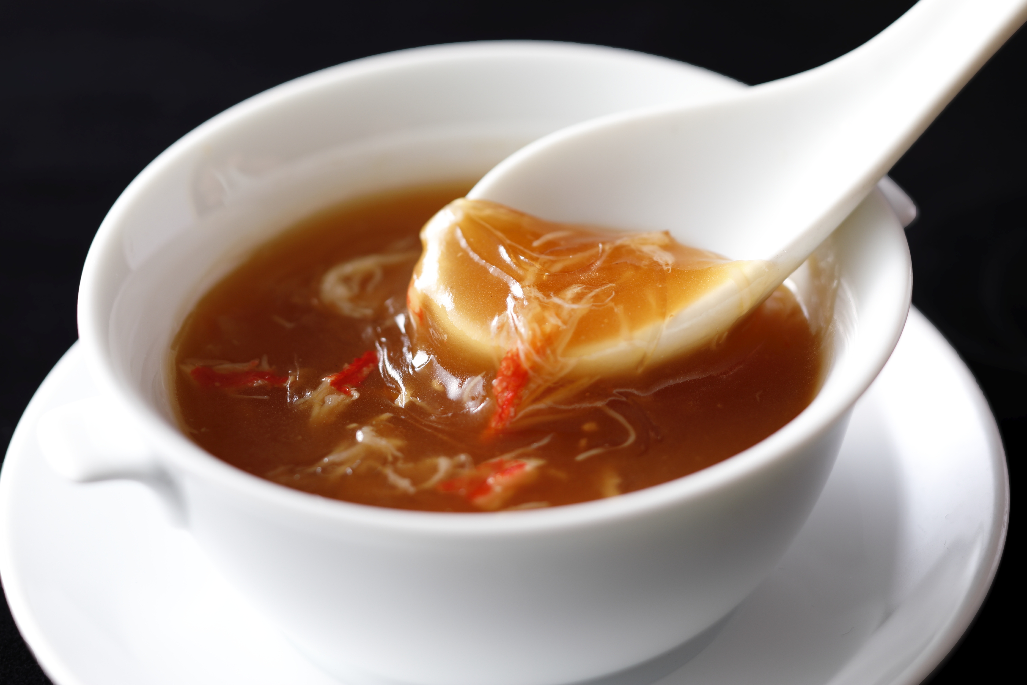 コースには、中華料理を語るうえでは欠かせない「ふかひれ」スープも登場。ふかひれは天日干しにすることで旨味や食感が増した乾燥素材を使用し、茹でては水に流して皮や軟骨を丁寧に取り除く作業を数日間繰り返して、丁寧に仕込みました。しっかりと味が染み込み、ほどよい柔らかさとつるんとした喉越しが特長のスープは、まさに「王道主義」を代表する逸品です。