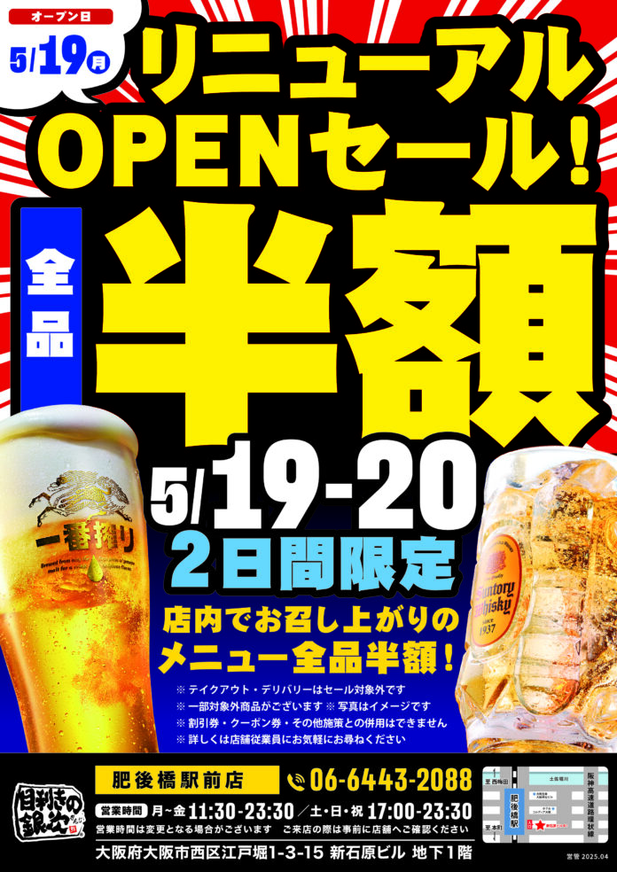 2025年5月19日(月)、大阪府大阪市の肥後橋駅前にある「目利きの銀次 肥後橋駅前店」がリニューアルオープン!2日間限定でオープン記念セール(店内でお召し上がりのメニュー全品半額)を開催します!