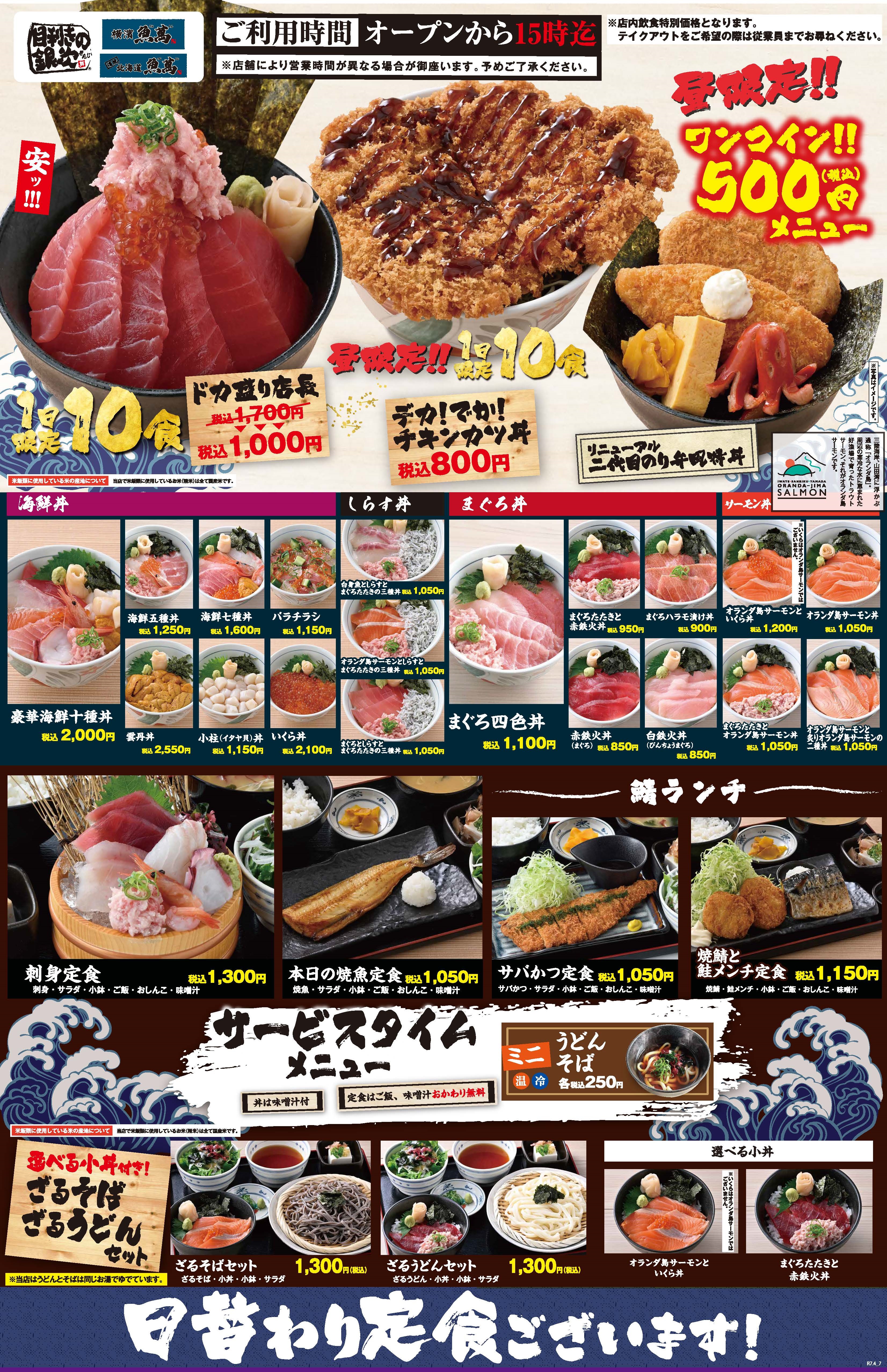 オープンから15時迄のサービスタイム(※2)限定で、「ドカ盛り店長(海鮮丼)税込1,000円」と「デカ!でか!チキンカツ丼(税込800円)」を一日10食限定で販売するほか、ワンコイン(税込500円)メニューとして、リニューアルしてさらに美味しくなった「二代目のり弁風特丼」や、ご飯と味噌汁が”おかわり無料”の「日替わり定食(税込1,050円~)」など、家計を応援する”得ランチ”を販売します。