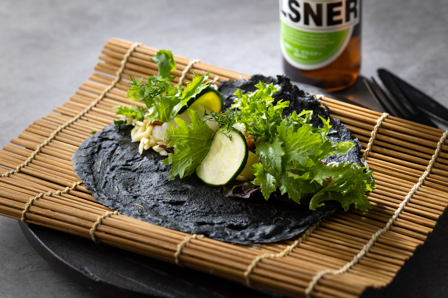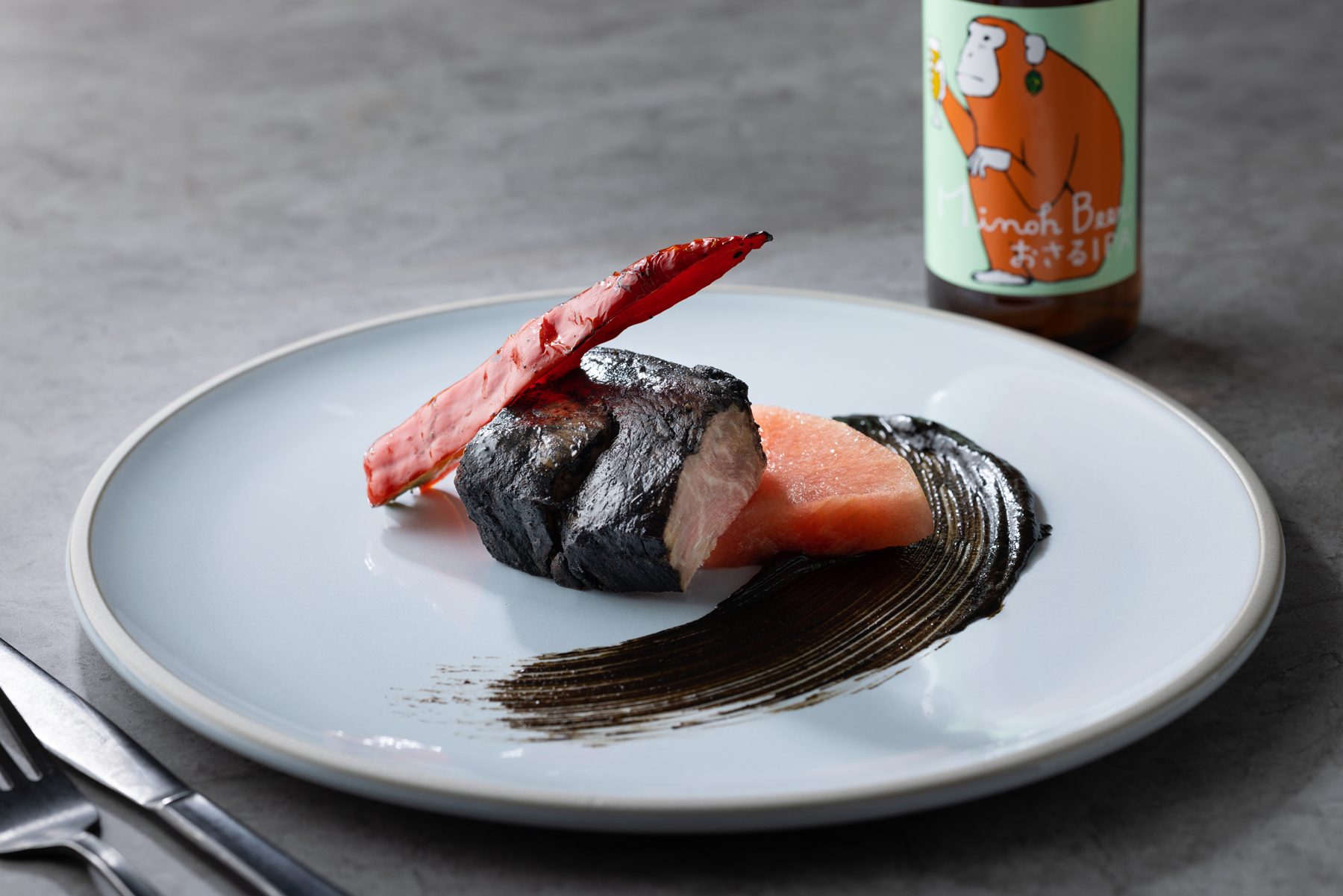 今夏は、日本の家庭料理とアメリカン料理を融合。わさび、にんにく、唐辛子などのスパイスを効かせ、見た目も印象的な”BLACK”で統一した料理をお届けいたします。前菜には、クレープ生地にのせた、明石蛸とかんぱち、リゾーニ、グレープフルーツなどお客様ご自身で巻いて手巻き寿し風にお楽しみいただきます。スープは、豚汁とアメリカの家庭料理であるガンボスープが出会った一品。大阪産「犬鳴豚」と夏野菜を煮込んだ中に、隠し味として加えた黒にんにく、赤味噌が奥行きのあるスパイシーな味わいを演出。魚料理は、イカ墨入りの衣を纏わせた夏が旬の鱧や賀茂なすを、焦がした唐辛子を入れたトマトソースとともにお召しあがりいただきます。淡泊な鱧の味わいに、トマトの風味がよく合い、唐辛子の余韻が楽しめます。肉料理は、照り焼きの技法を応用し、大阪産「能勢黒若牛」に特製ソースを何度も塗り重ねて丁寧に焼き上げました。添えられたすいかの甘みがソースや肉の味わいを引き立てます。締めの麺料理は、店名のLAVAROCK(溶岩石)をイメージ。山から噴き出す溶岩、スープを注ぐと流れ出す熱いマグマのような見た目を、冷製麺で表現しました。暑さを逆手に取った、シェフのユニークな感性が光る一品です。デザートは、水ようかん、マンゴー、ココナッツジェラートが合わさった和モダンなパフェにいたしました。さらに、地元大阪の地ビールの味をお届けしたいという想いから、各料理に合わせて選んだ箕面ビールもご紹介いたします。
