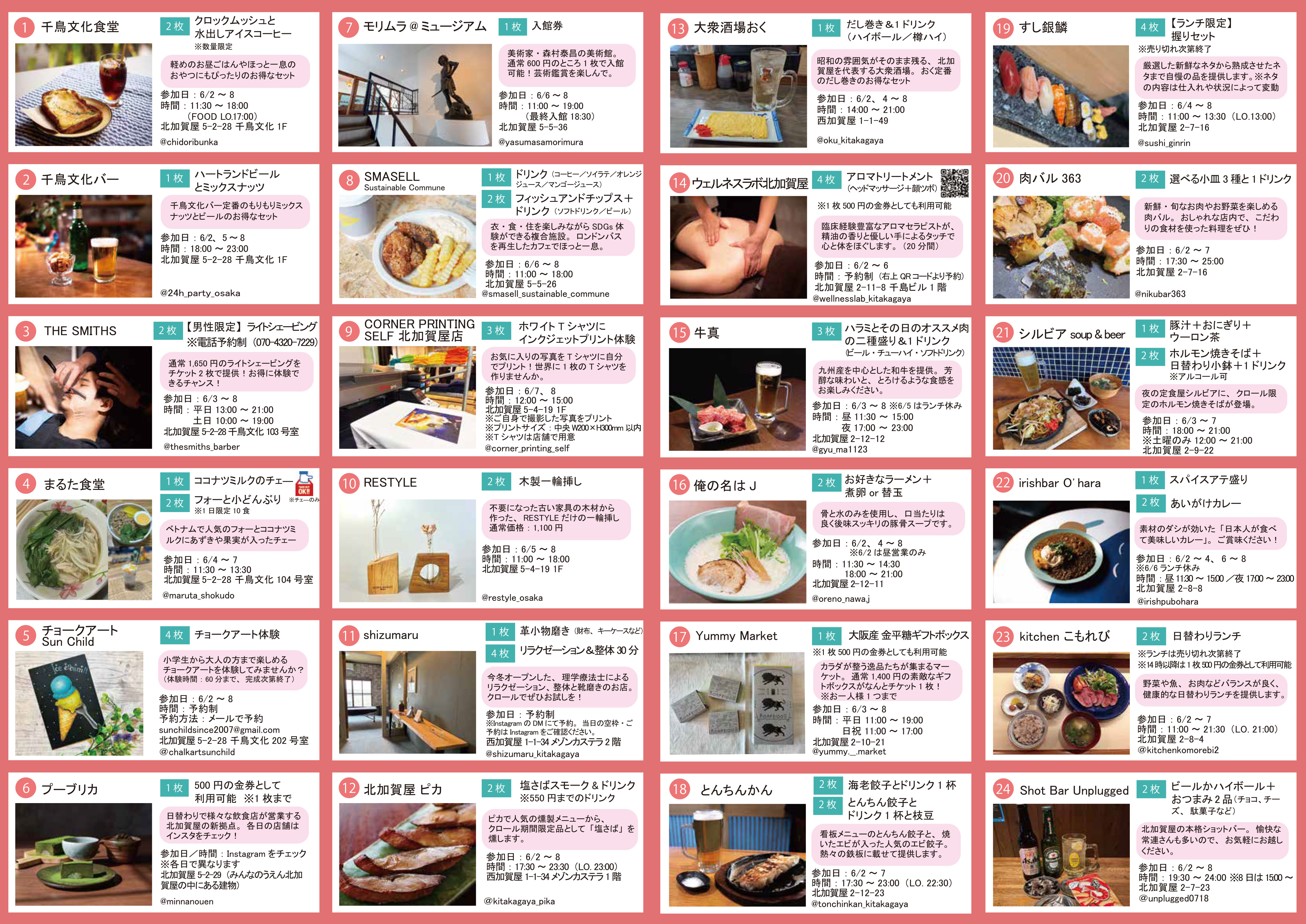 第3回目となる今回は、参加店舗が増加し、カフェや居酒屋、雑貨店、ワークショップなどバラエティ豊かな40店舗が参加。各店舗が、お得な「北加賀屋クロール特別メニュー」を用意して、みなさまをお迎えいたします。