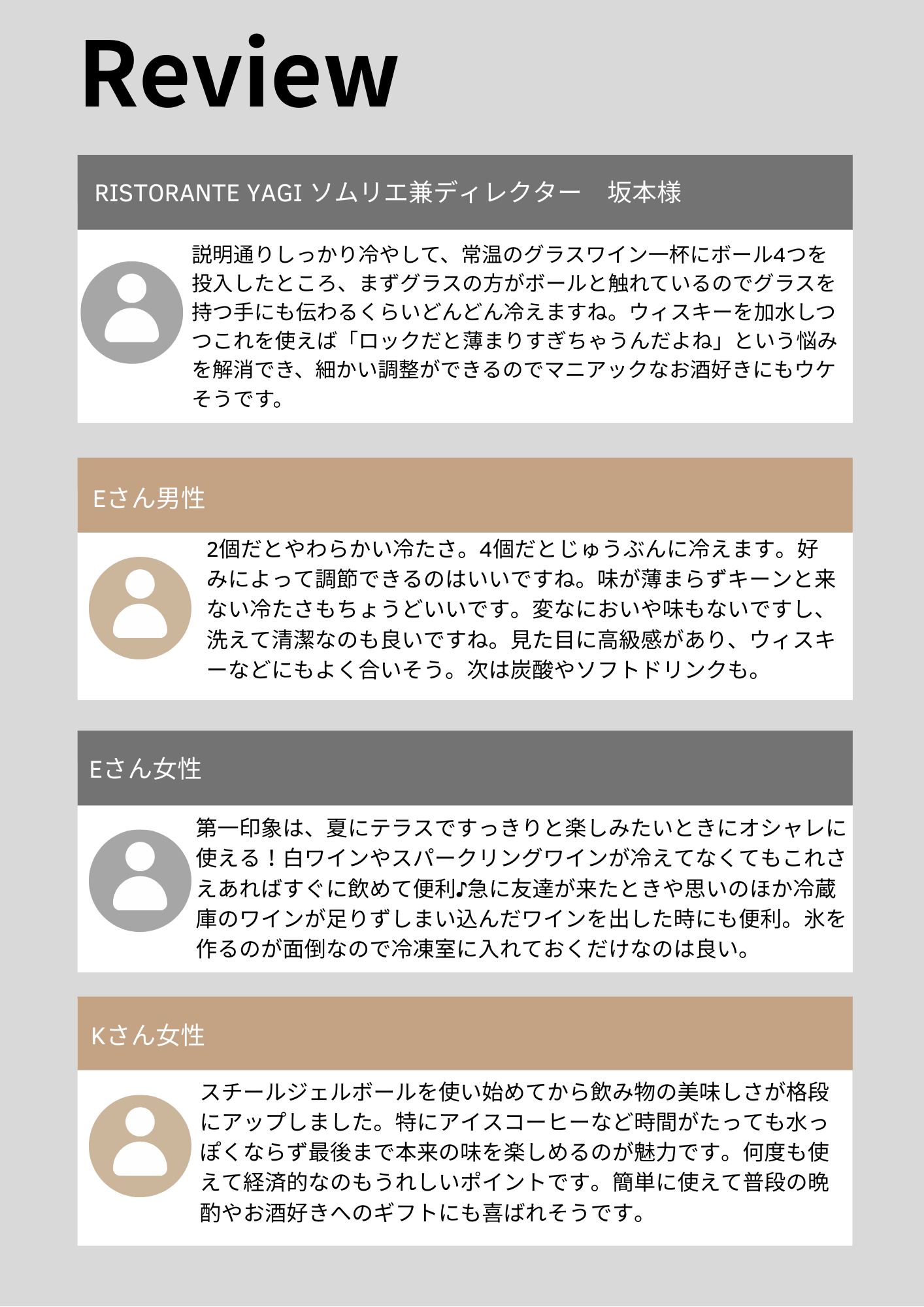 一般的なアイスキューブはサイズ2㎝台で重量30g台なのに対し、【Steel Gel Ball】はサイズ3㎝台で重量20g台と比較的大きめサイズの割に軽量なのも特長です。