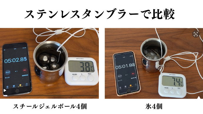 左の氷は溶けて水の層が出来ているのが見えます。右の【Steel Gel Ball】は薄まらず溶けず、冷たくて美味しそうです。