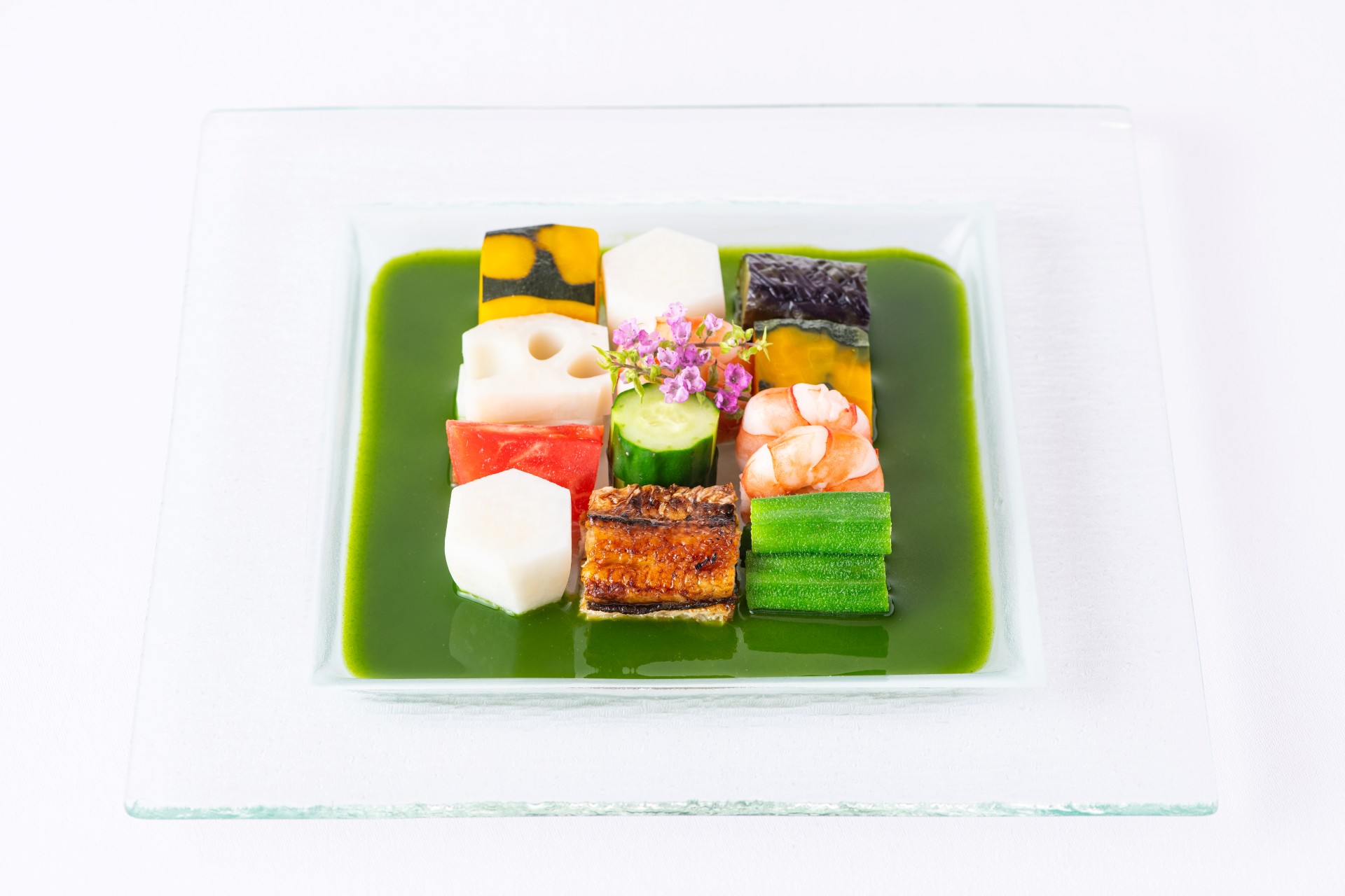 ・夏野菜と海老の煮物 鰹出汁とケールの冷やし餡かけ