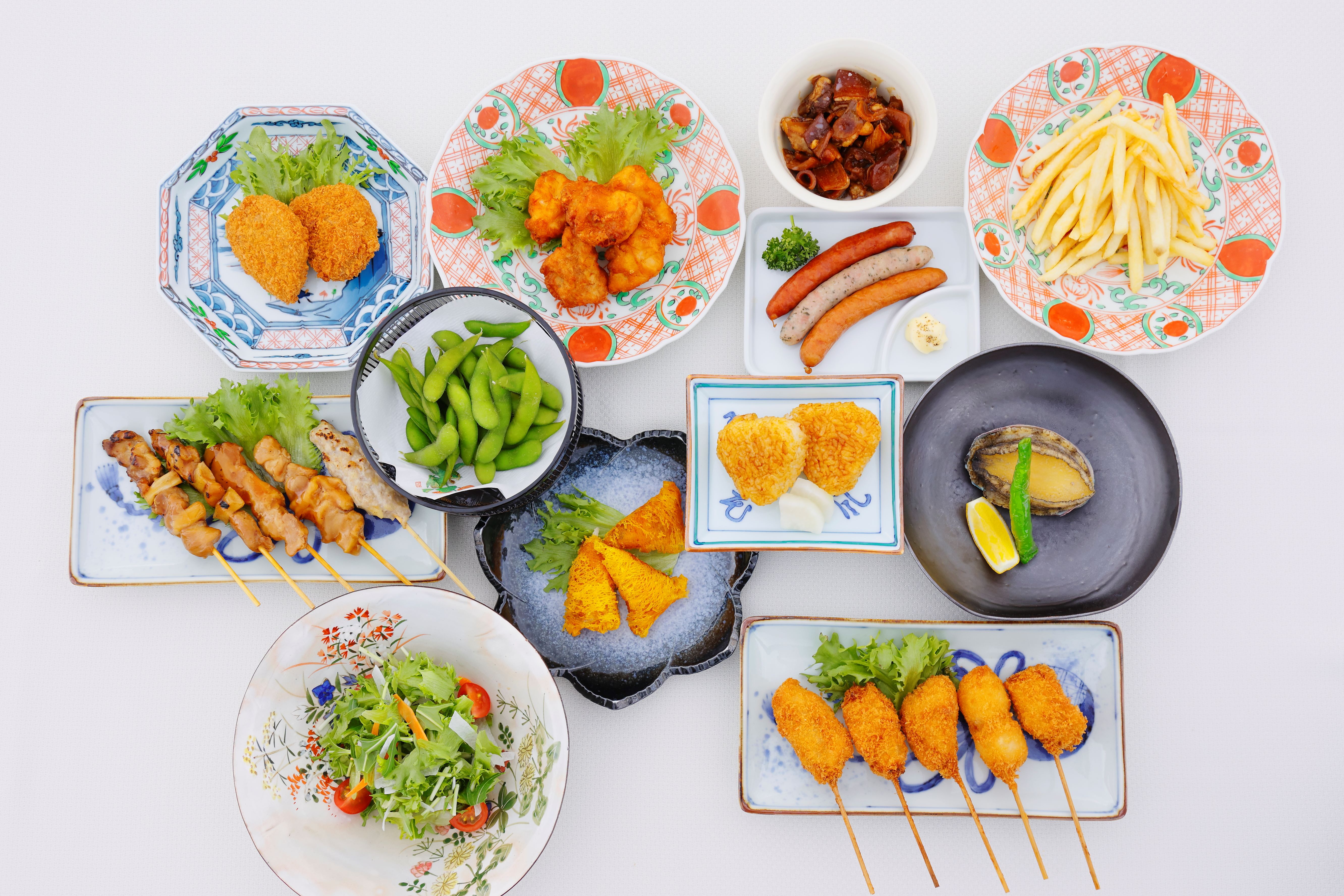 ・枝豆 ・ポテトフライ ・焼き鳥盛合せ ・串揚げセット ・鶏唐揚げ