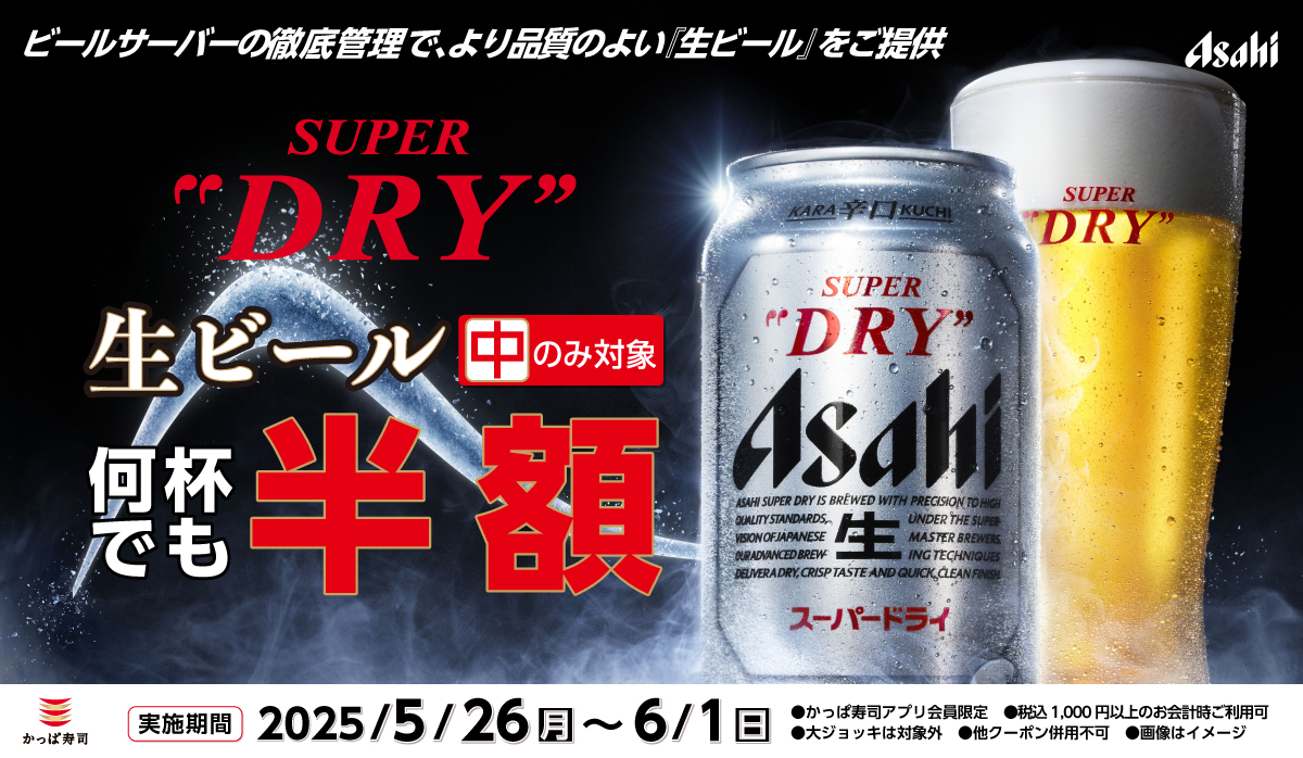 コロワイドグループのかっぱ寿司(カッパ・クリエイト㈱ 本社:神奈川県横浜市、代表取締役社長:山角豪)は、2025年5月26日(月)~6月1日(日)の期間、かっぱ寿司公式アプリにて「生ビール(中)」が半額で楽しめるお得なクーポンを配信いたします。