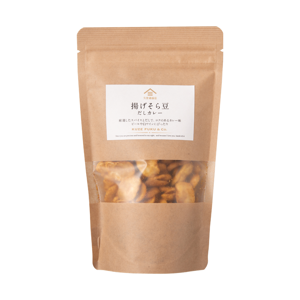 じっくり揚げたそら豆に、こだわりのスパイスとだしをブレンドした粉末をまぶして、コク深いカレー味に仕上げました。サクッとした食感とともに、スパイスの香ばしさとだしのまろやかさが口いっぱいに広がり、一口ごとにクセになる味わいです。