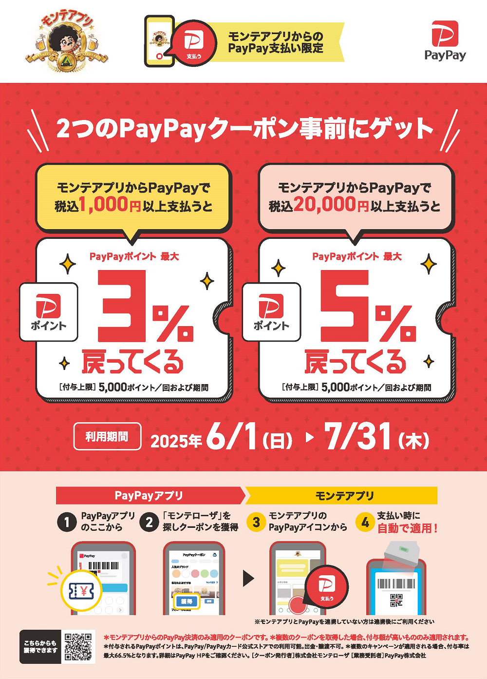 同時開催:モンテアプリからのPayPay決済限定!PayPayクーポン配信!