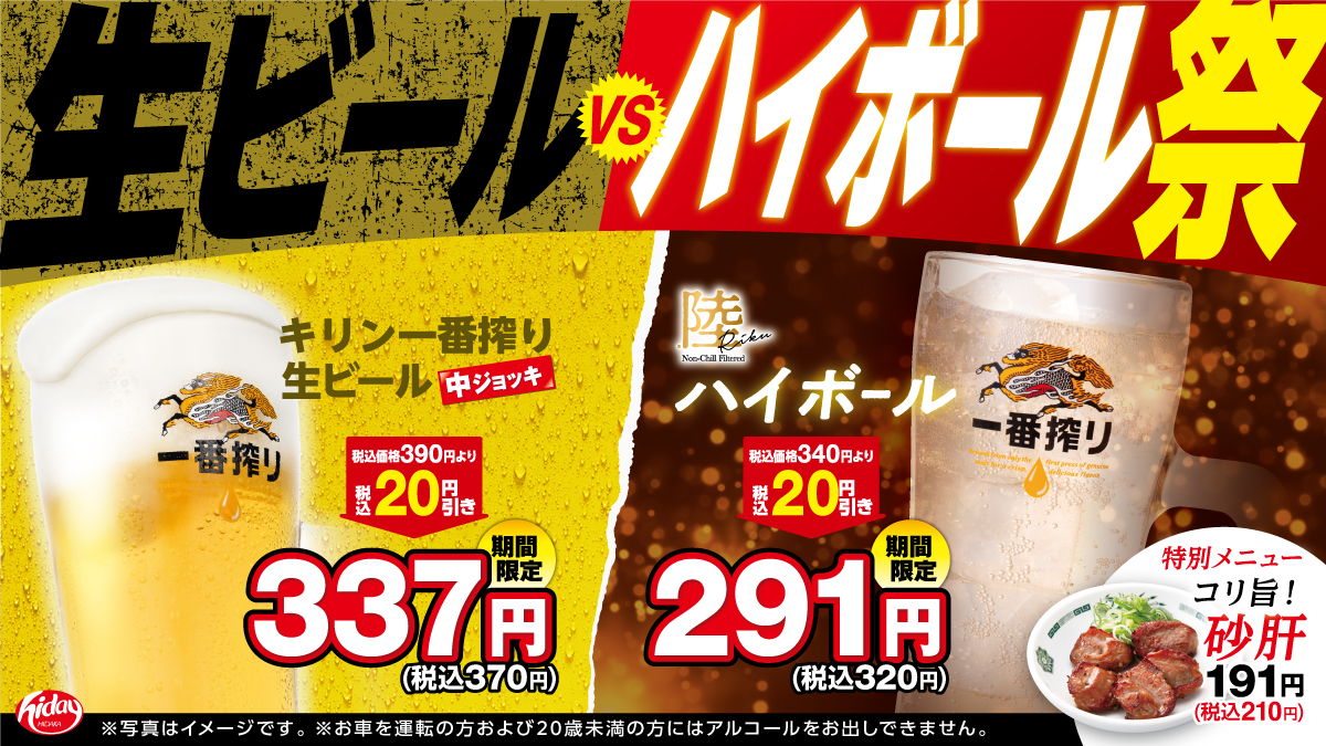 期間中、「キリン一番搾り(生)/ (中ジョッキ)」を本体価格355円(税込390円)のところ337円(税込370円)に、「陸ハイボール」を本体価格310円(税込340円)のところ、291円(税込)320円)にて販売致します。※一部、提供商品が異なる店舗がございます。