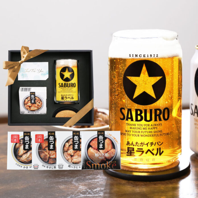 GOLDSTARシリーズは、ユーモアたっぷりのメッセージと名入れが魅力の人気ライン。これまではグラス単品や家庭用ビアサーバーとのセットを販売していましたが、今年新たに登場したのが「缶つま」とのペアリングによるギフトセット。