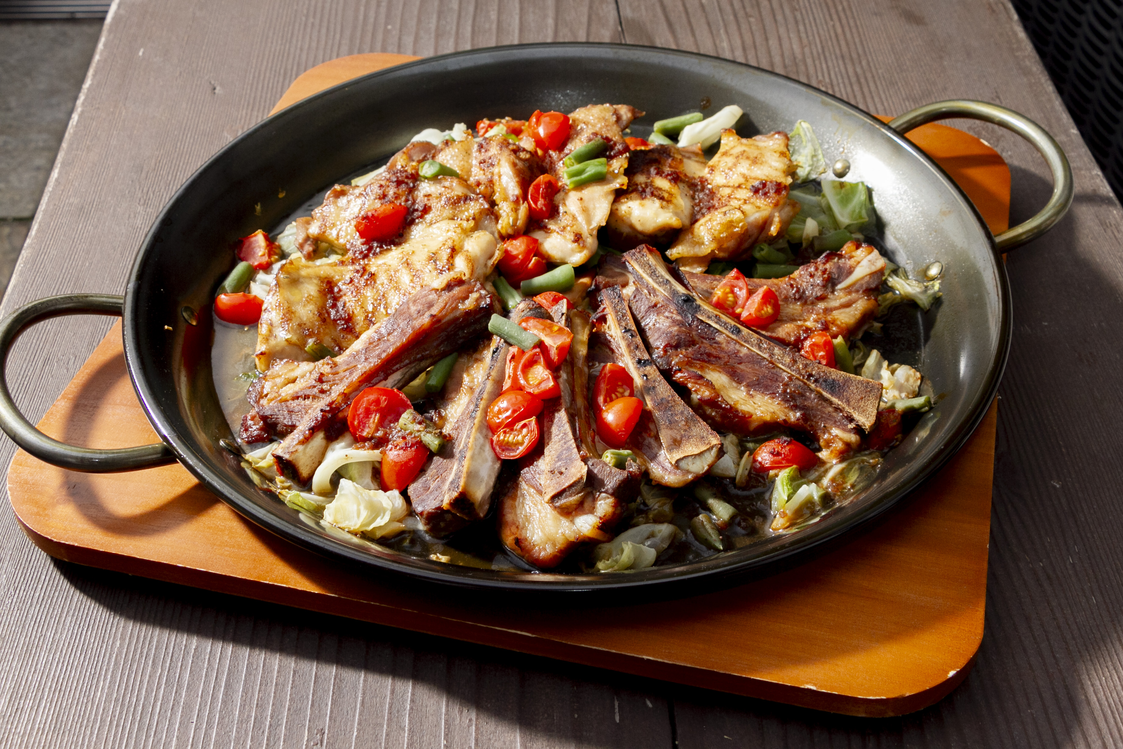 メインディッシュのお勧めは、具沢山でおこげが最後のお楽しみ「シーフードパエリア」、遠慮なく手でガシッと噛みしめたいジューシーな「骨付きスペアリブとローストチキン」は食べ応えが抜群、熟練のシェフがジャストの火入れ「国産牛タリアータ」はレストランシェフならではのハイクオリティの一皿。その他「ガーリックトースト」や「グリルソーセージ」等の名脇役で抜かりなく。
