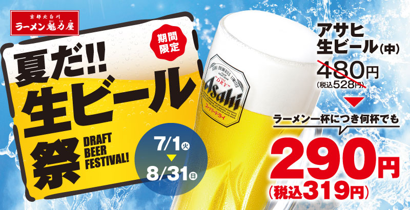 魁力屋では、2か月の期間中ずっと、ラーメン一杯ご注文につき、通常1杯528円(税込)の生ビールを何杯でも1杯319円(税込)でお楽しみいただけます。