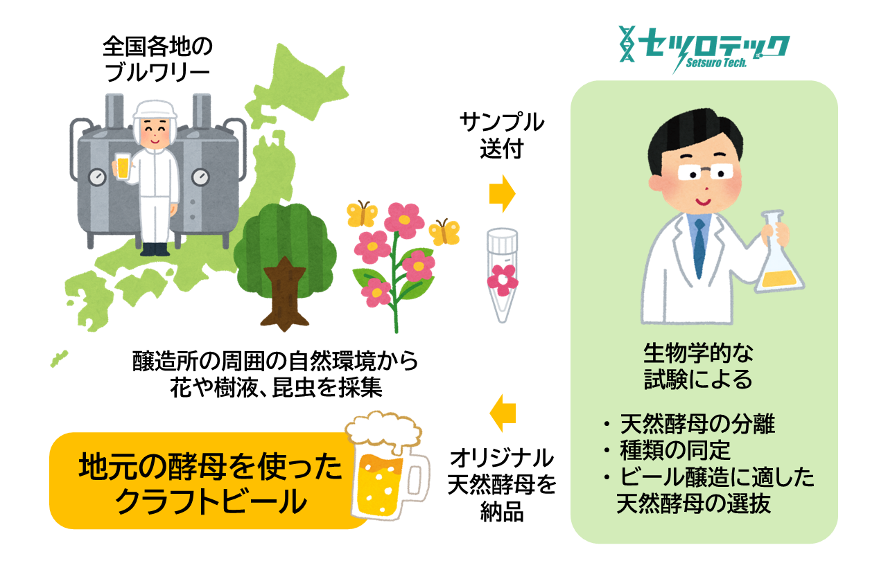 昨今はクラフトビール戦国時代、国内約700社が形成する360億円市場とも言われています。さまざまな魅力的なビールが次々と造られるなか、生き残れる商品を開発するには明確な差別化が勝負を決します。地域特産の副材料や多様なビールの種類、PR戦略が鍵となる中、セツロテックは地域独自の自然環境から天然酵母を採取し、ビール造りに活かすというアプローチを提案します。