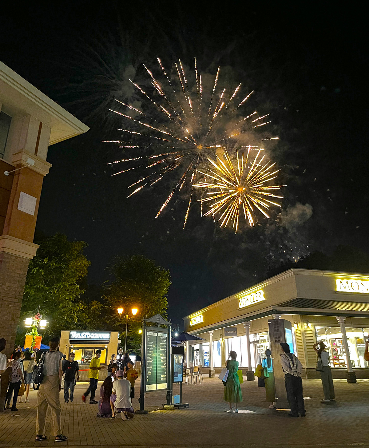 どこかノスタルジックで夏を感じさせる楽曲に乗せてお届けする花火プログラム。敷地内から打ち上げる迫力満点な花火を、間近でご覧いただけます。アウトレットで楽しんだ1日の締めくくりに、真夏の夜を彩る花火をぜひご観賞ください。