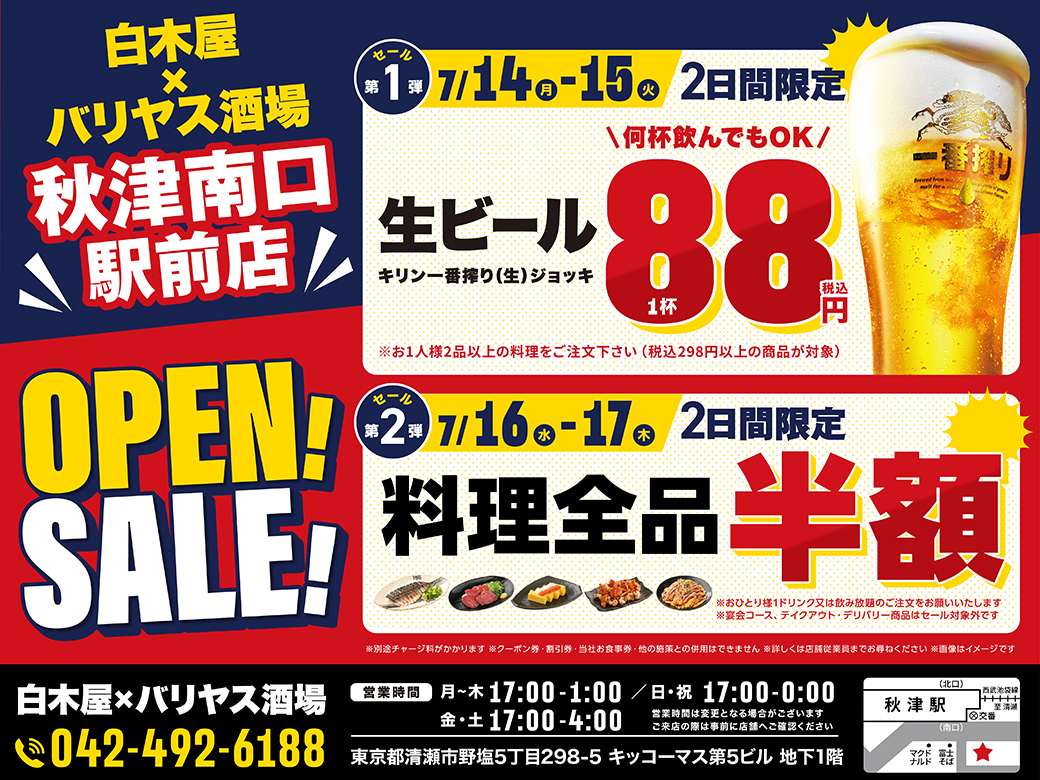 「白木屋×バリヤス酒場 秋津南口駅前店」では、オープンを記念したセールを開催いたします!