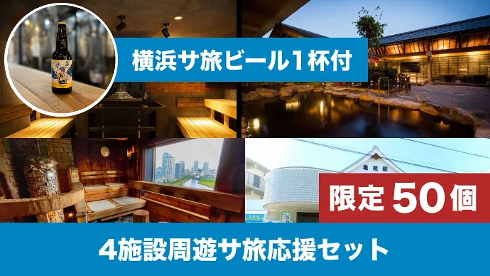 「横浜サ旅」の対象施設4施設と「サ旅ビール」を20%OFFで楽しめる1番オススメのリターンです!「横浜サ旅」オリジナルステッカーもついてきます。