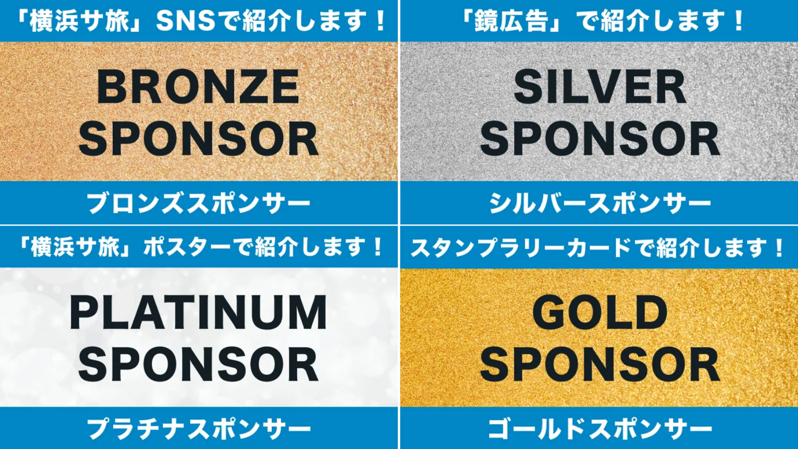 横浜サ旅の公式SNSで商品や会社のロゴを掲載できるプランを始め、横浜サ旅に参画している3施設「HARE-TABI」、「満天の湯」、「亀遊舘」の浴室の鏡広告、対象施設に会社や商品のポスターを掲載できるプランなど、4種類のスポンサー枠などもご用意しています。