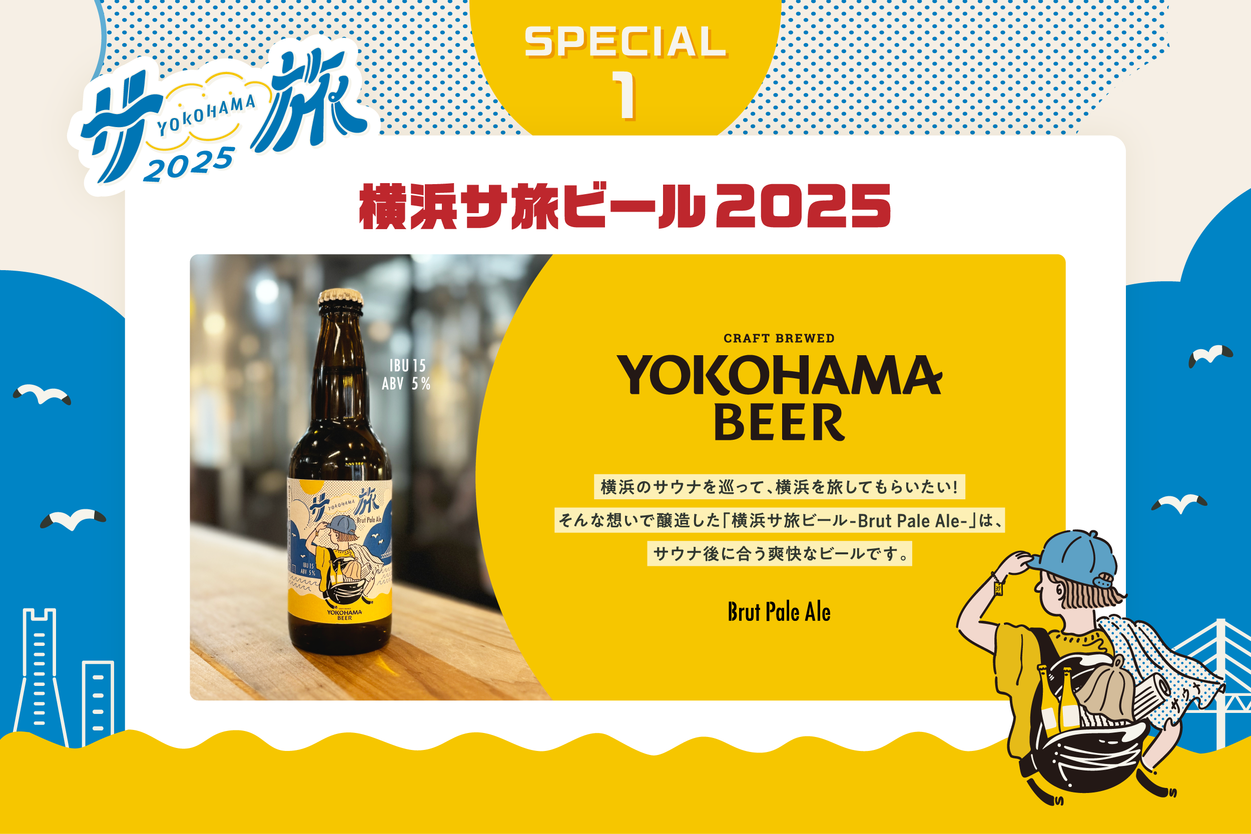 【企画1】サウナ後の一杯にぴったりな期間限定オリジナルビール『横浜サ旅ビール-Brut Pale Ale-』を横浜のサウナ施設や観光スポットで8月1日(金)より順次販売開始。