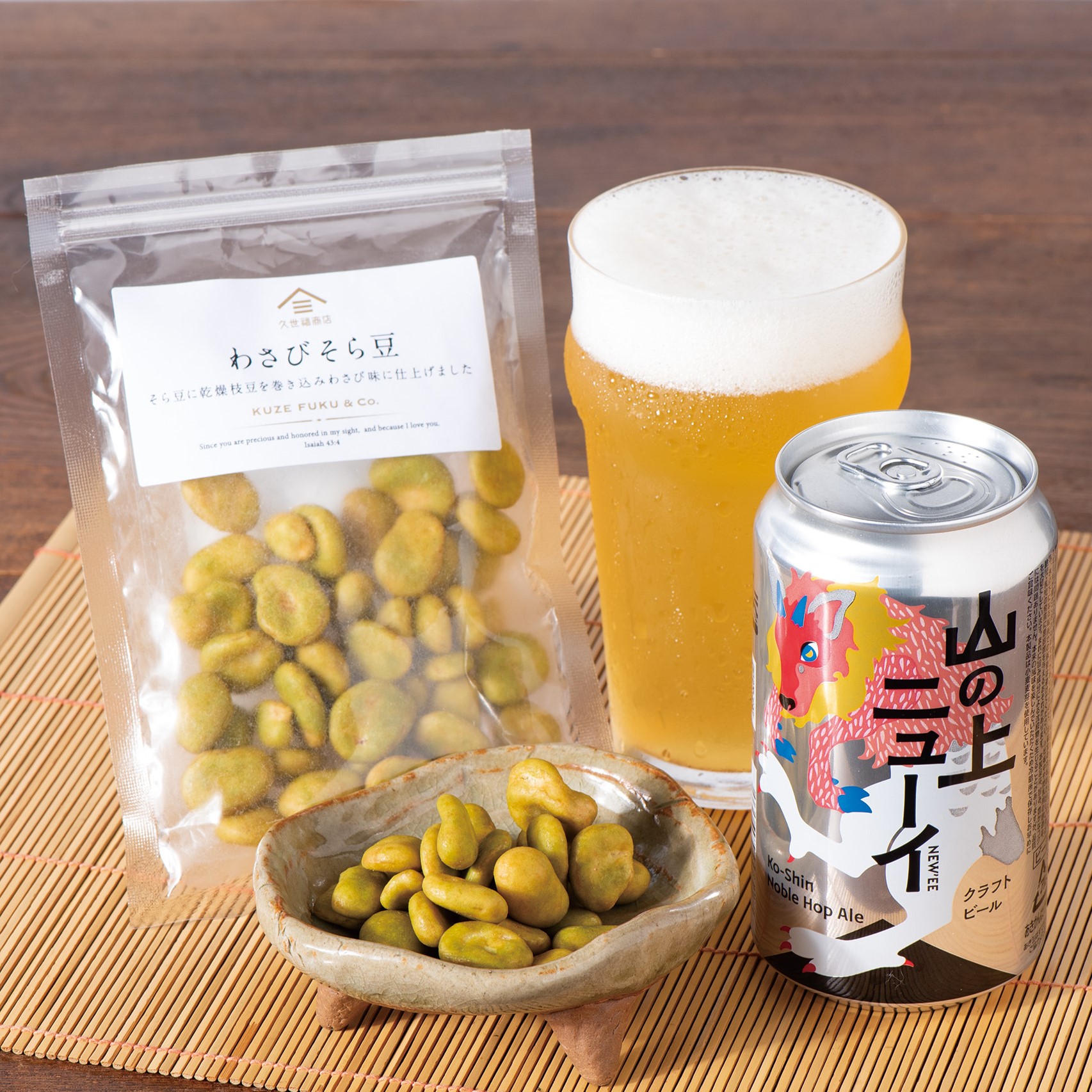 『山の上ニューイ』は、甲信地方(山梨・長野)にルーツを持つ日本産ホップを使用した爽やかな香りのクラフトビールです。缶にはカモシカの上半身と雷鳥の下半身を持つ架空の動物「ニューイ」が描かれています。『わさびそら豆』の辛みとビールの軽やかな味わいは絶妙で、手が止まらないほどのおいしさです。