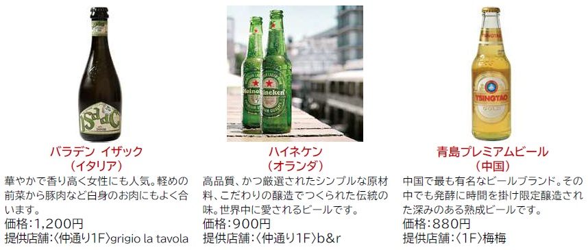 「世界を味わうBEER FESTA」では、館内各店が取扱うイタリア・オランダ・シンガポール・中国・ベルギーに、日本を加えた世界6カ国・20種類のビールをセレクト。国内外の多彩なビールを味わえる本フェアは、ビール愛好家にとって見逃せない機会です。