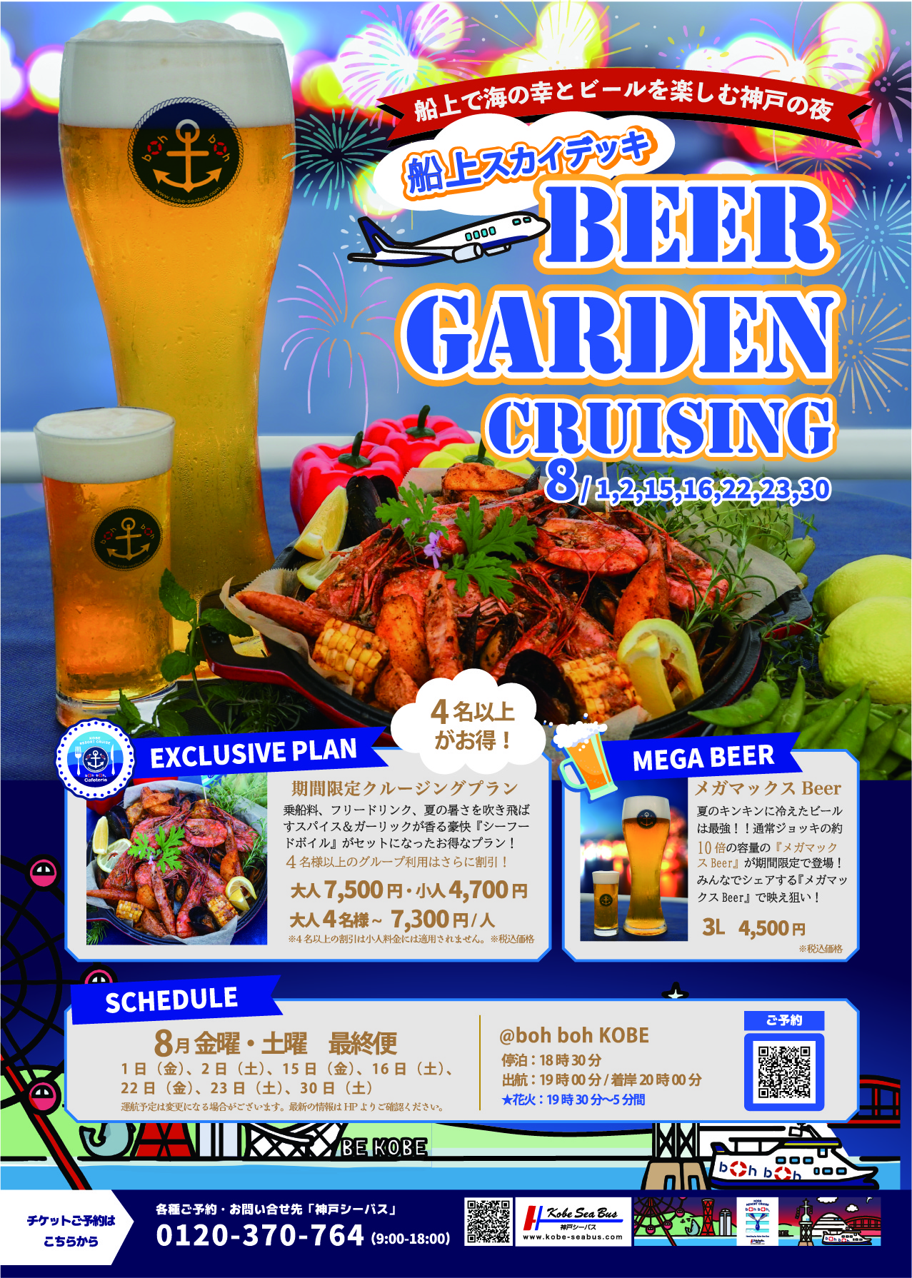 8月の毎週金曜日と土曜日には、boh boh KOBEで「船上スカイデッキBEER GARDEN CRUISING」を開催します!週末は船上で海、神戸の街並みを眺めながらシーフードボイルとビールを堪能しましょう♪