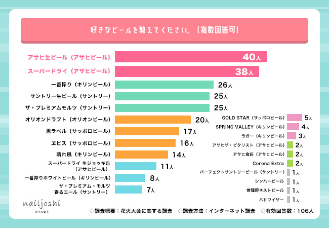 ・好きなビール1位は『アサヒ生ビール(アサヒビール)』(40人)、2位『スーパードライ(アサヒビール)』(38人)、3位『一番搾り(キリンビール)』(26人)