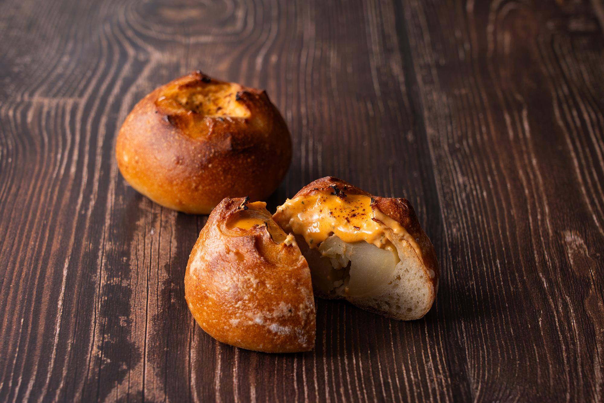 南ドイツ・バイエルン地方の定番おつまみの一つでもある玉ねぎの風味と岩塩の旨味が引き立つチーズディップを、低温長時間発酵にこだわったレトロバゲットの生地にじゃがいもと一緒にとじ込めたビールに合うおつまみブレッドをご用意いたしました。