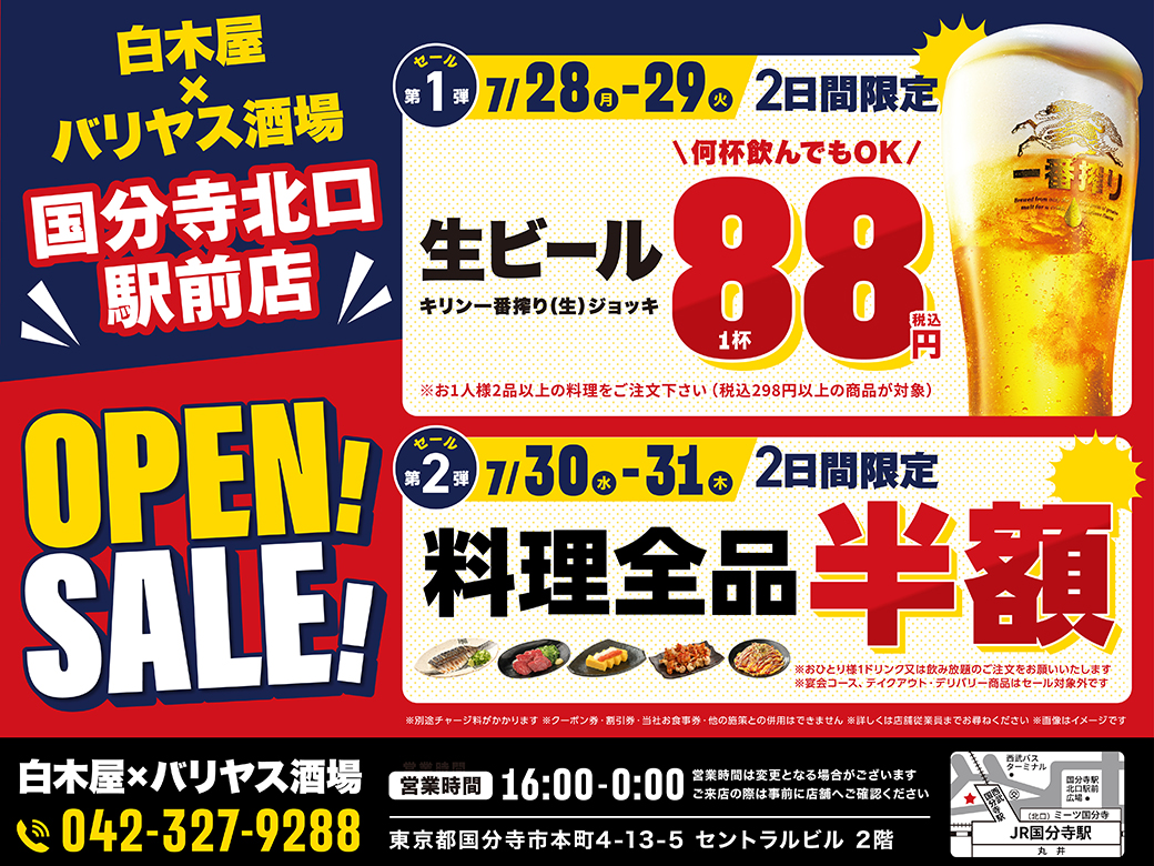 「白木屋×バリヤス酒場 国分寺北口駅前店」では、オープンを記念したセール開催!